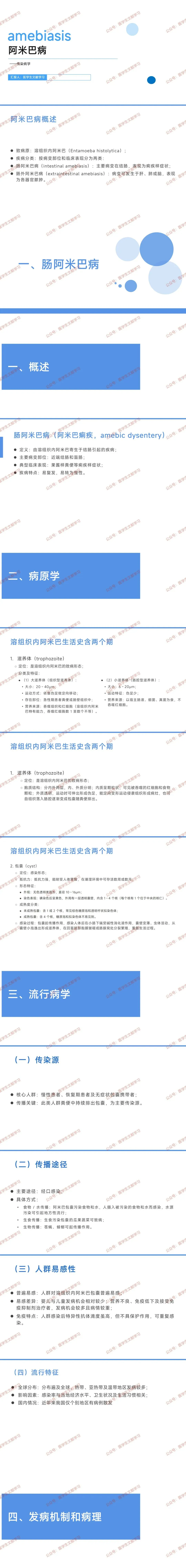 定义:溶组织内阿米巴寄生结肠所致疾病,又称阿米巴痢疾,主要表现为痢疾样症状,易复发、慢性化。