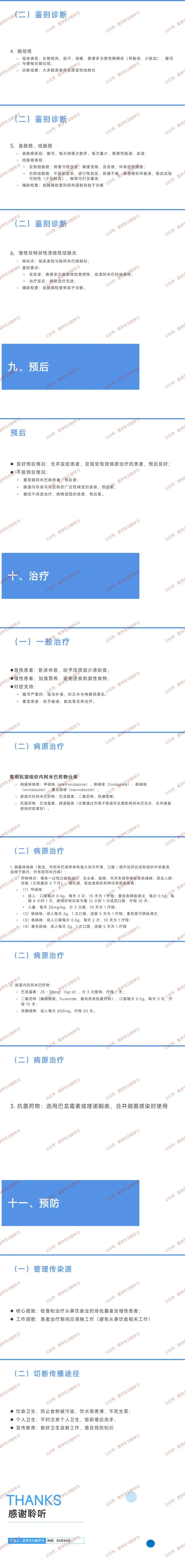 血清学检查:IgG 抗体阳性提示既往或现症感染,IgM 抗体阳性提示近期感染;检测粪便滋养体抗原,特异度、灵敏度高,阳性可确诊。