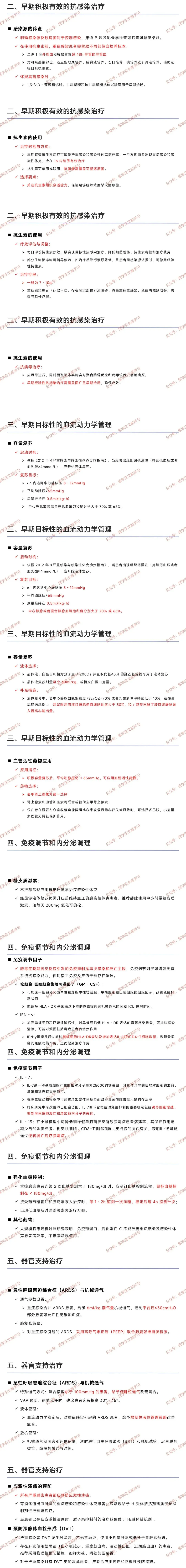 - 血管活性药物:容量复苏后平均动脉压<65mmHg 时使用,去甲肾上腺素为首选,可联合肾上腺素或血管加压素。