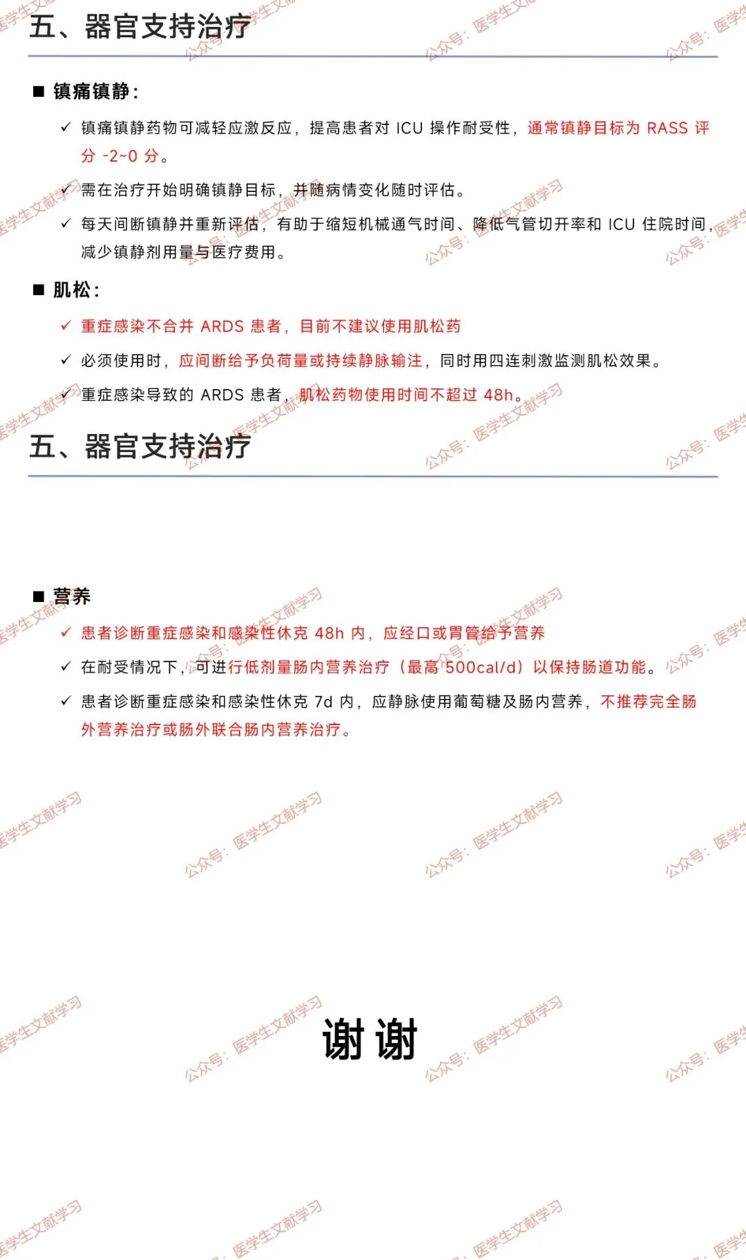- 呼吸支持:ARDS 患者采用 6ml/kg 潮气量机械通气,平台压≤30cmH₂O;氧合指数<100mmHg 时俯卧位通气;VAP 预防需床头抬高 30°-45°;血流动力学稳定后采用限制性液体管理。