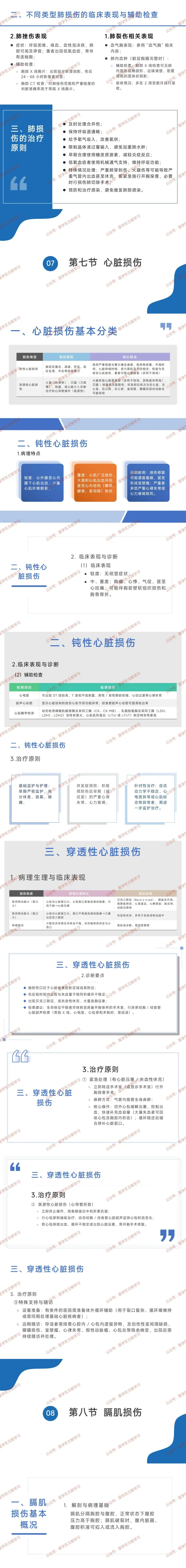 穿透性心脏损伤:由火器、刃器、锐器或心导管操作(医源性)导致,火器多致贯通伤且多死于现场、异物留存率高,刃器 / 锐器多为盲管伤,好发部位依次为右心室、左心室、右心房、左心房,室间隔等也可能受损。