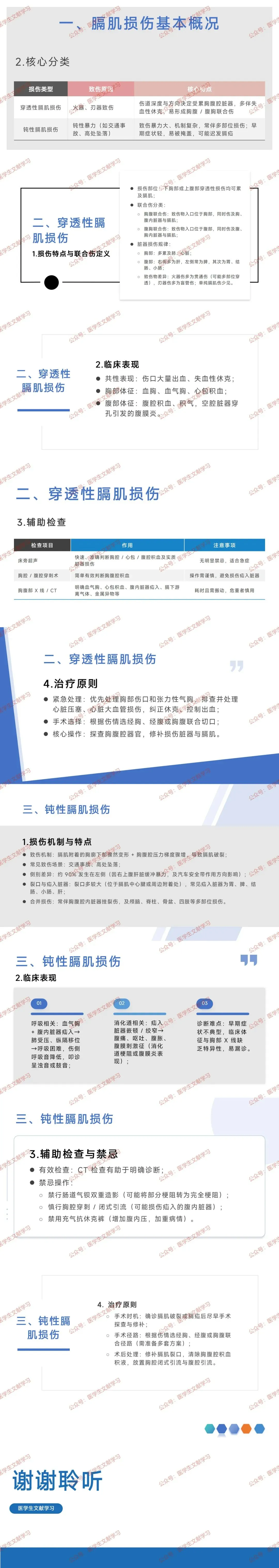 穿透性膈肌损伤:火器、刃器致伤,伤道深度与方向决定受累脏器,多伴失血性休克,易形成胸腹 / 腹胸联合伤。