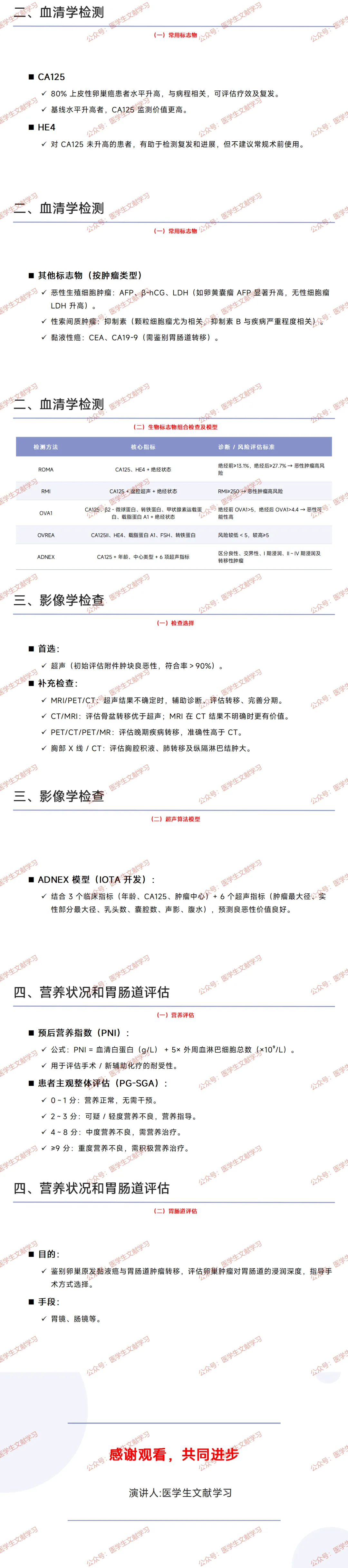 血清学检测:CA125(评估疗效及复发)、HE4(补充 CA125 阴性病例);生殖细胞肿瘤查 AFP、β-hCG,性索间质肿瘤查抑制素。
