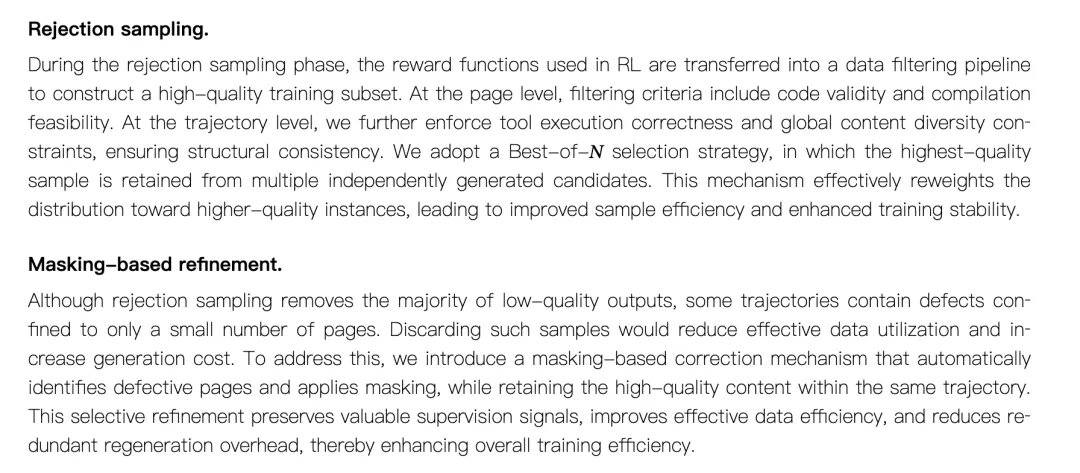 训练过程中采用了多种稳定化策略。动态采样会概率性丢弃结构简单的样本,让复杂页面得到充分训练;同一样本的不同生成结果分散到多个批次中,减少优化偏差。这些设计保障了强化学习阶段的稳定性。拒绝采样阶段将奖励函数转化为数据过滤工具。在页面层面筛选代码有效性和编译可行性,在轨迹层面检查工具执行正确性和内容多样性,最终从多个候选中选出最佳样本。这种Best-of-N策略有效提升了训练数据的质量分布。掩码机制解决了部分页面存在缺陷的轨迹处理问题。系统能够自动识别并屏蔽问题页面,保留同一条轨迹中的高质量内容,避免了因少数坏页而丢弃整批数据造成的浪费,提高了数据利用效率。实验数据显示,生成页面符合16:9标准比例的比例从40%提升至92%,页面溢出问题大幅减少。在与GLM-4.5的对比中,GLM-5在内容质量、布局合理性和视觉美感三个维度分别取得60%、57.5%和65%的胜率,总体胜率达到67.5%,验证了训练框架的有效性。智谱这次技术报告的价值,展示了PPT生成的技术细节,也揭示了一个趋势:通用大模型的竞争会逐步下放到垂直领域,解决核心垂直领域的共性问题。对创业公司来说,通用模型的垂类能力增强是压力,也存在机会。特定场景下建立定义标准的能力,仍然是小团队可以构建的护城河。知道什么是好的往往比怎么生成更难,智谱的技术路线,或许给所有做垂类应用的团队提供了一个可参照的优化框架。奖励函数设计比模型架构更重要