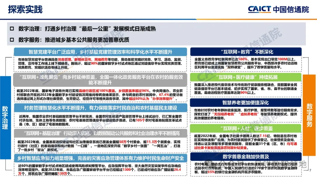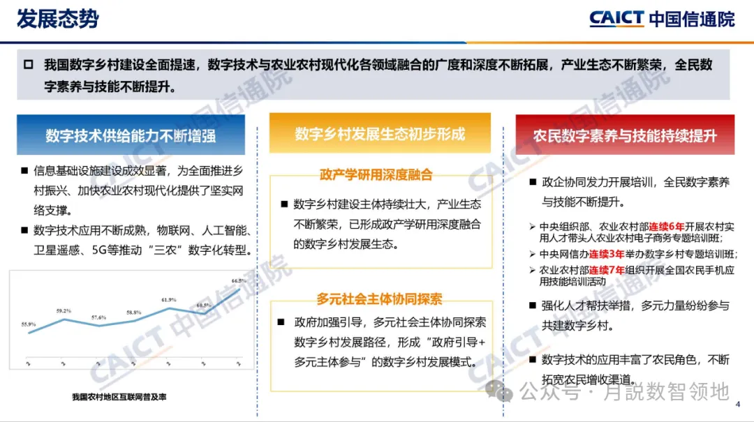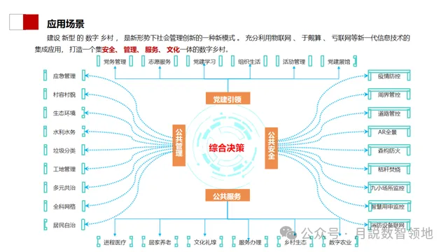 数字乡村建设是指利用数字技术和信息化手段,推动农村现代化、智慧化发展的过程。在数字乡村建设中,涵盖了多个具体内容,旨在提升农村基础设施水平、改善农民生产生活条件、促进农村产业发展,推动农村经济社会全面进步。未来乡村发展的方向是产业化、现代化、旅游文化传承、生态环保、数字化智能化以及民生改善和共同富裕等多方面的综合发展。数字乡村建设是实现未来乡村发展的重要手段,需要加强数字化基础设施建设、推进数字化农业发展、提升乡村旅游服务水平、优化公共服务体系、强化乡村治理数字化、加强人力资源培训、创新金融支持方式和加强政策引导及产业扶持等方面的措施。通过这些措施的实施,可以加快数字乡村建设进程,推动实现乡村振兴战略目标。在此,【月説·数智行业·领地】汇总了《数字乡村总体设计指南》包括数字乡村总体设计解决方案、数字乡村发展实践白皮书(2024年)解读···等相关内容资料~·数字乡村总体设计解决方案(66页 PPT).ppt