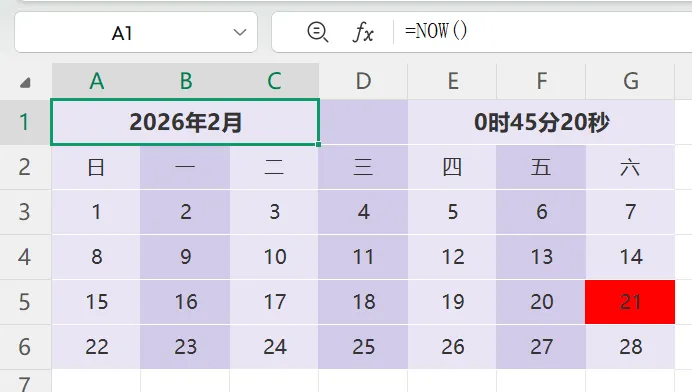 首先需要做一个动态日历,新建一个表格,在第一行设置当前时间,即=NOW(),在下一行填上周日-周一的文本。