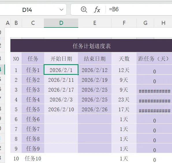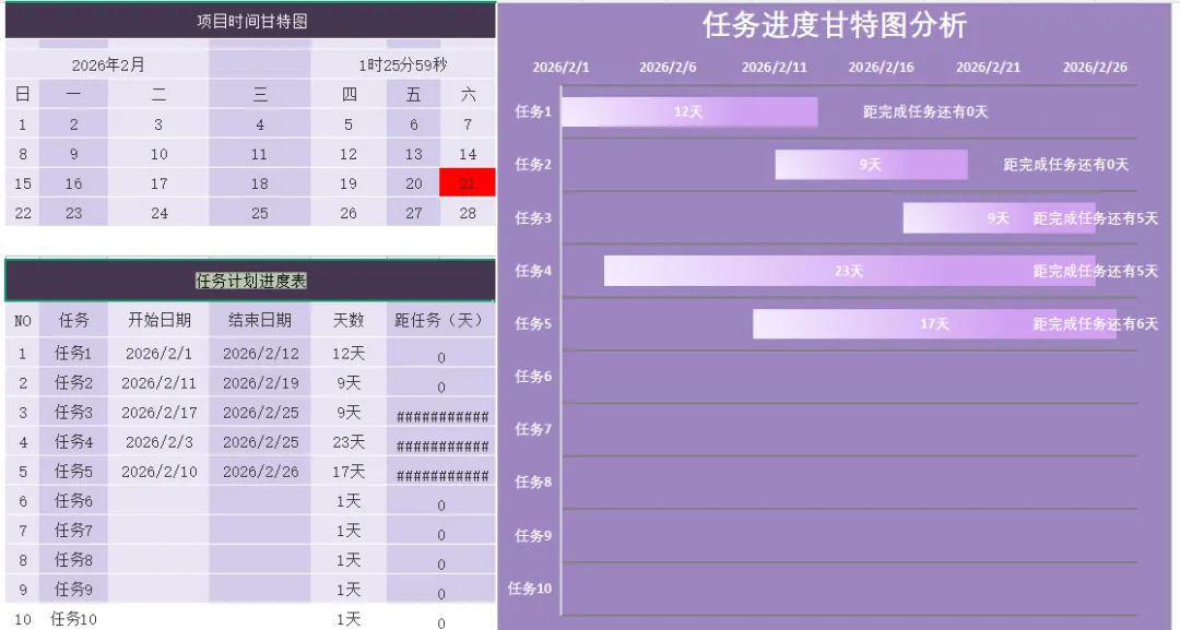 选择日历上的日期为开始/结束日期;天数=结束日期-开始日期;任务剩余时间=IF(TODAY()<结束日期,开始日期-TODAY()+1,"0")