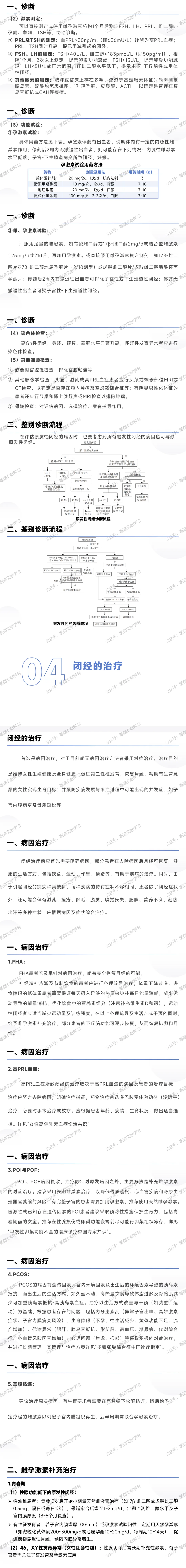 - 鉴别流程:原发性闭经先查第二性征与 FSH,继发性闭经从激素水平(PRL、FSH/LH)逐步排查病因。