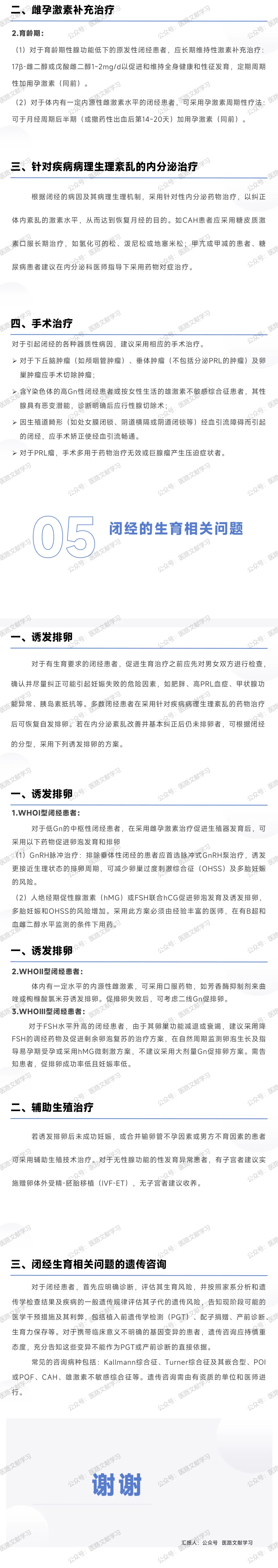 - 育龄期:诱发排卵(WHOⅠ 型用 GnRH 脉冲或促性腺激素,Ⅱ 型用克罗米芬 / 来曲唑),辅助生殖技术(如试管婴儿)。