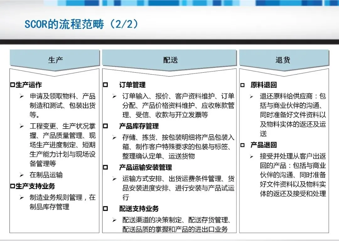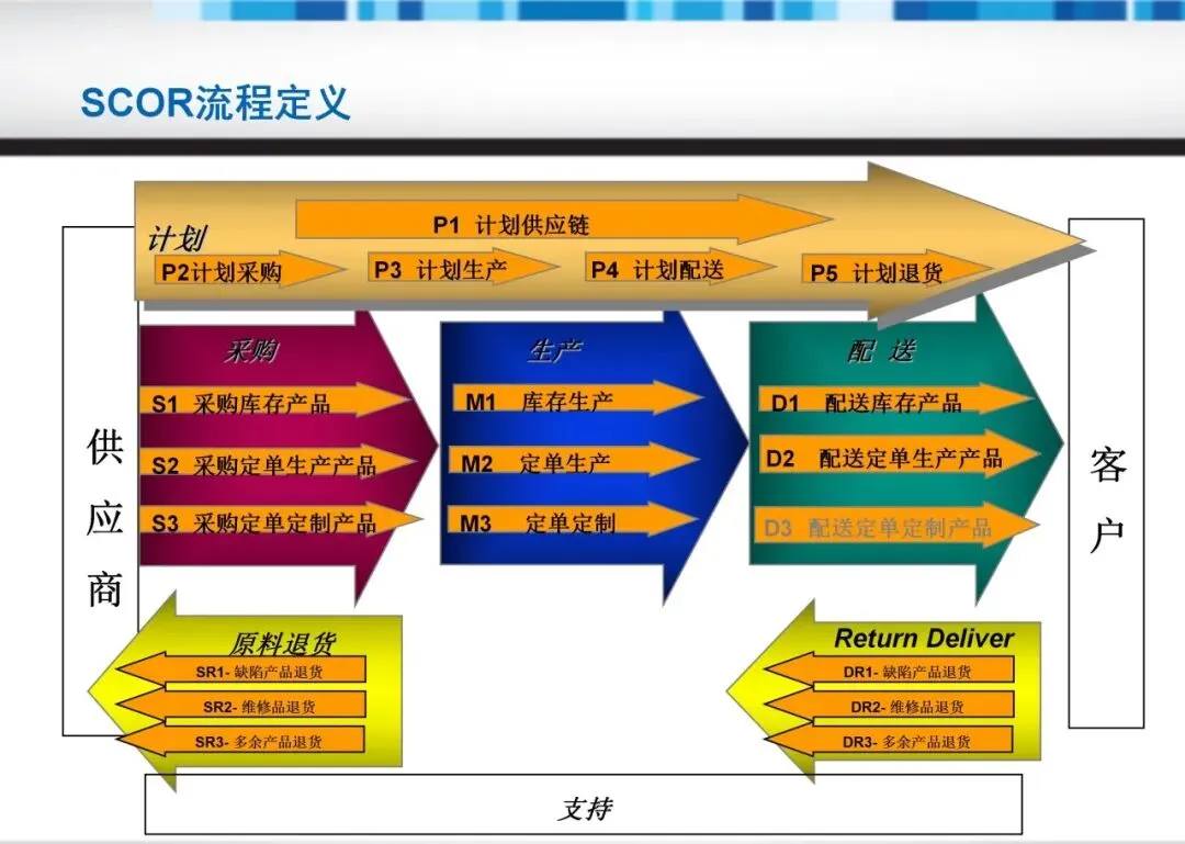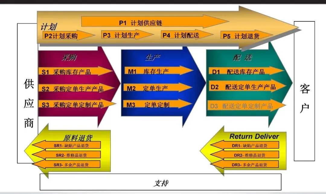 SCOR模型将供应链活动划分为五大核心流程:计划、采购、生产、配送与退货。这种分类不仅覆盖从需求预测到退货处理的端到端环节,还强调各环节的集成与协同。例如,计划流程需平衡资源与需求,而执行流程则聚焦实物转化。通过定义流程元素与性能指标,团队能量化改进潜力,避免局部优化导致的整体效率损失。