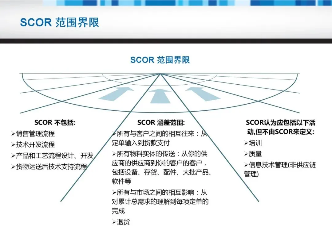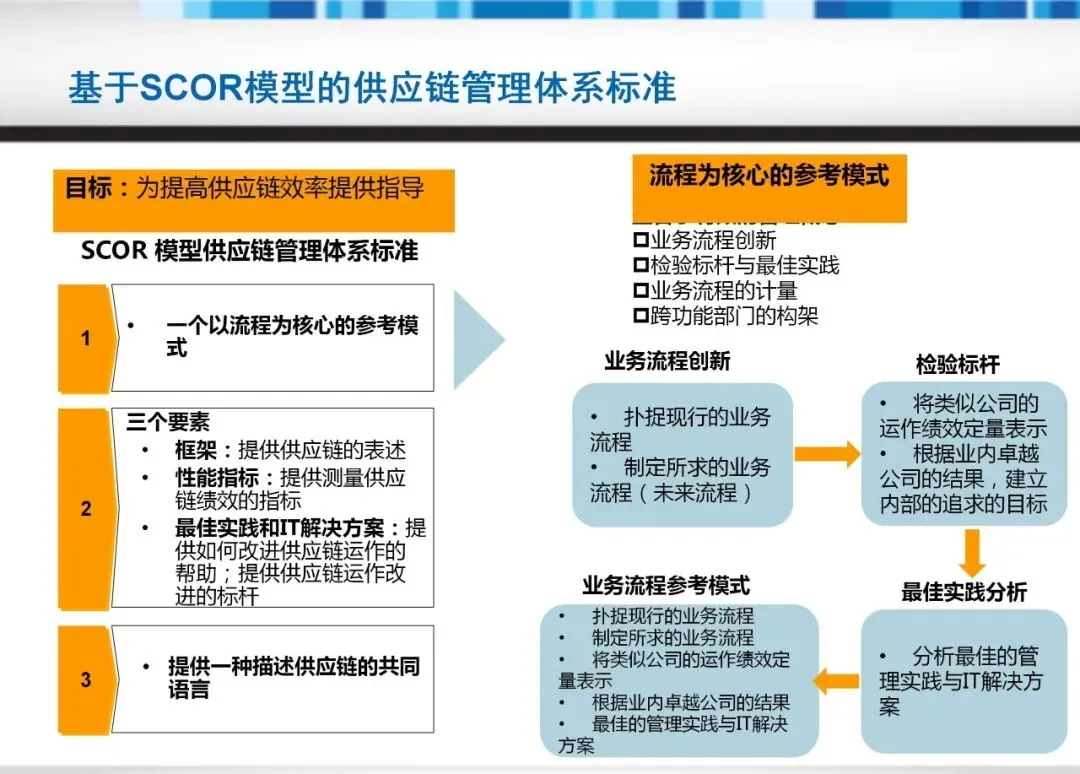 实施SCOR模型能带来多重收益:一是通过流程可视化识别瓶颈,如采购决策延迟或配送效率低下;二是借助标杆比较,定位行业最佳实践;三是强化供应链财务影响,优化资产周转与成本结构。