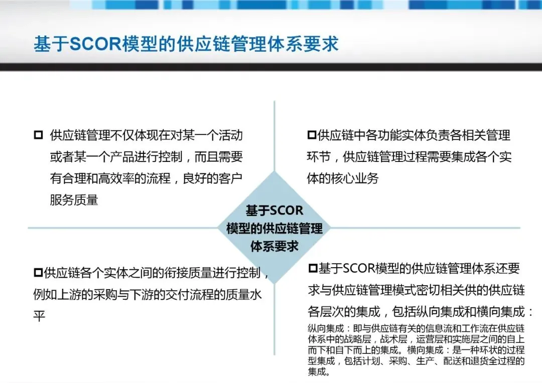 模型要求纵向与横向集成:纵向确保战略层至执行层的信息流畅,横向实现计划至退货的全过程闭环。这种集成能减少随机性问题(如供应商可靠性或需求波动),并通过标准化流程降低协调成本。实践中,团队需先界定流程范畴,例如采购环节包括供应商评估、物料管理及运输协调,而配送环节涵盖订单处理与客户服务。