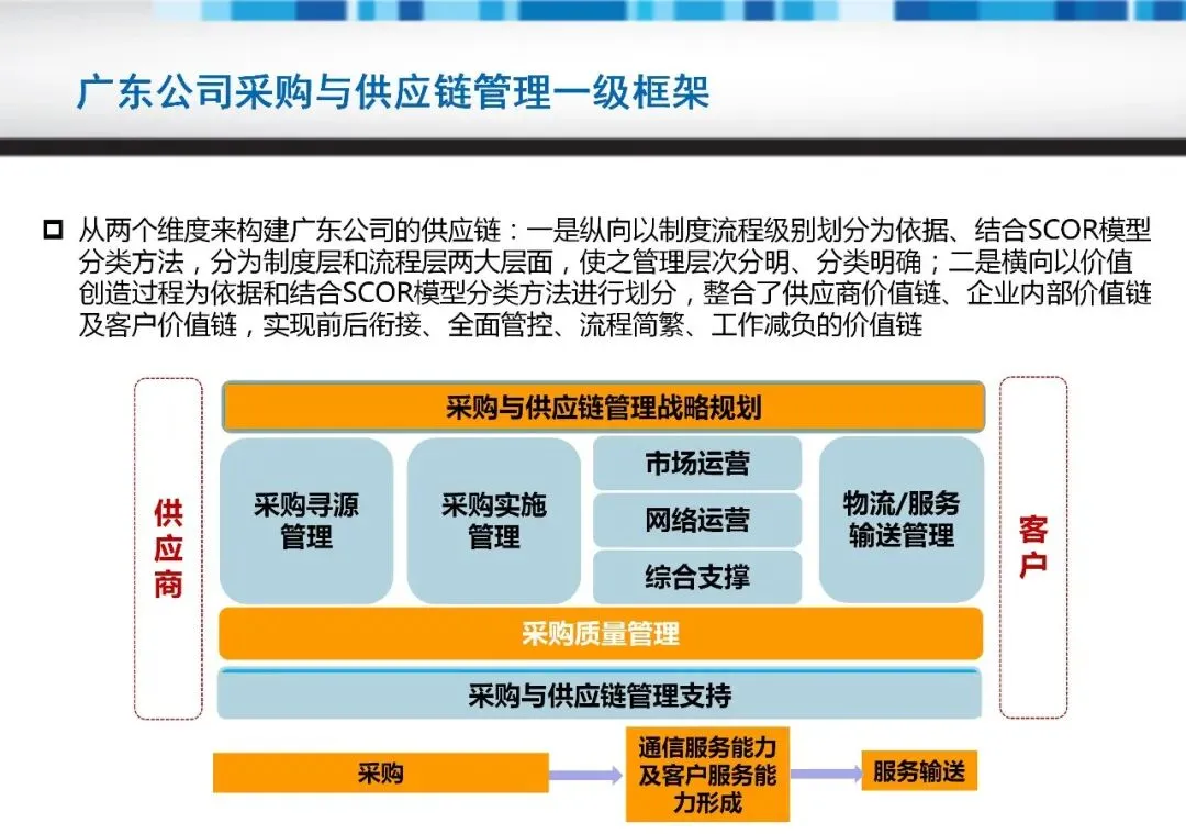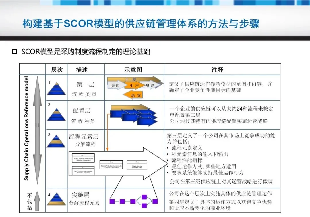 构建SCOR体系需遵循四层方法:从顶层流程类型到底层实施细节。初始阶段聚焦配置层,定制适合业务场景的流程种类;随后细化至流程元素层,定义输入输出及绩效指标。这一过程中,支持元素如数据管理、规则建立至关重要,它们为流程稳定性提供基础。例如,库存管理需与计划流程联动,以最小化冗余;而性能评估则驱动持续改进。