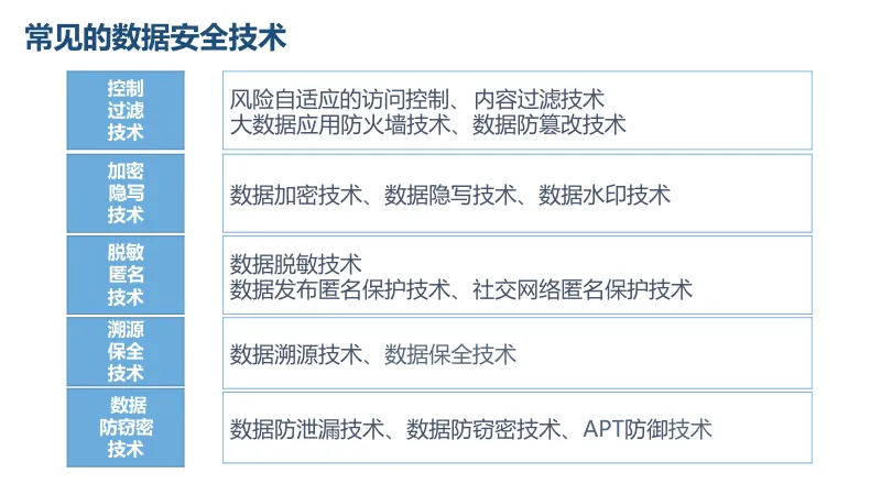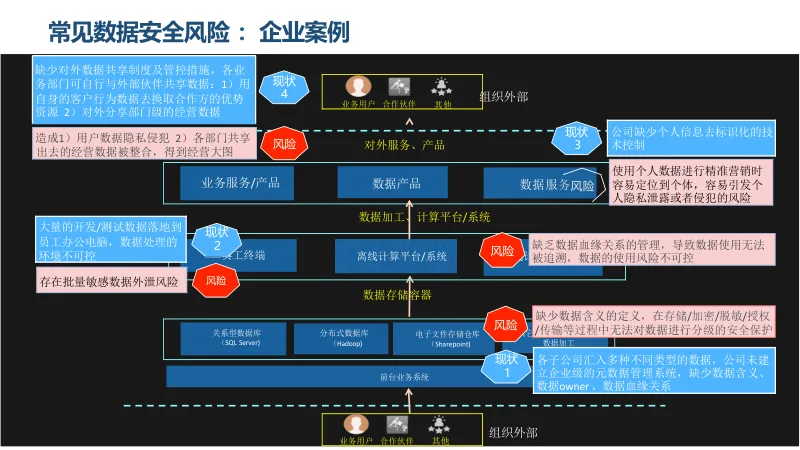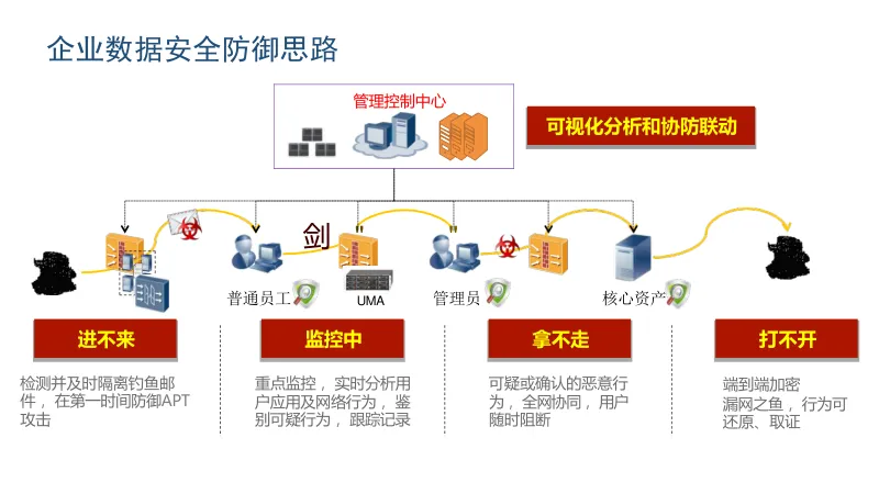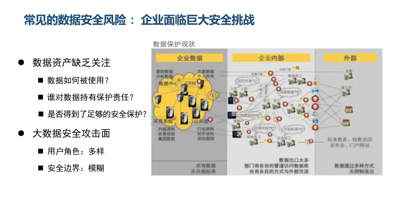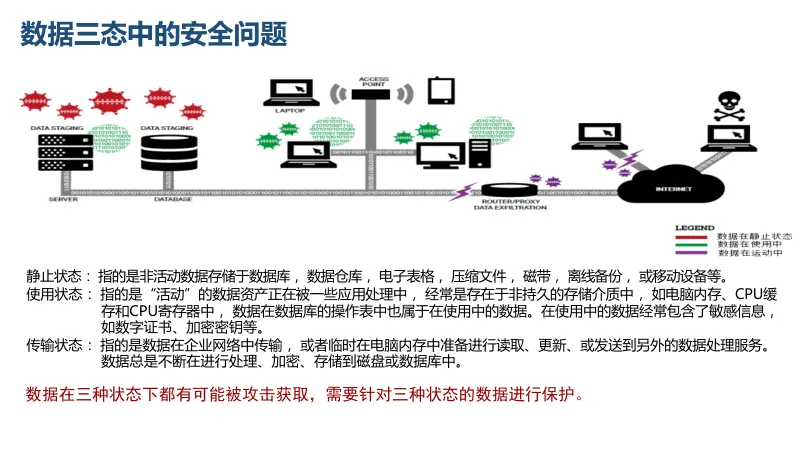 1.数据三态防护:静态数据加密脱敏、传输数据端到端加密、使用中数据严控访问与行为监控