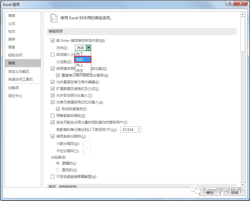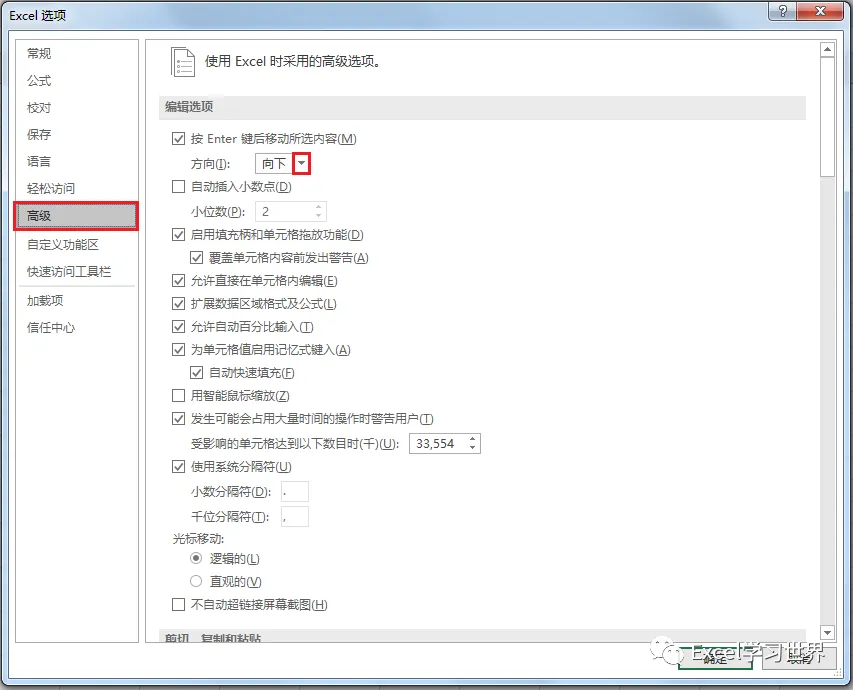 2. 在弹出的“Excel 选项”对话框中选择“高级”--> 在“编辑选项”区域可以看到“按 Enter 键后移动所选内容”下面的方向默认是“向下”--> 将它改成“向右”--> 点击“确定”