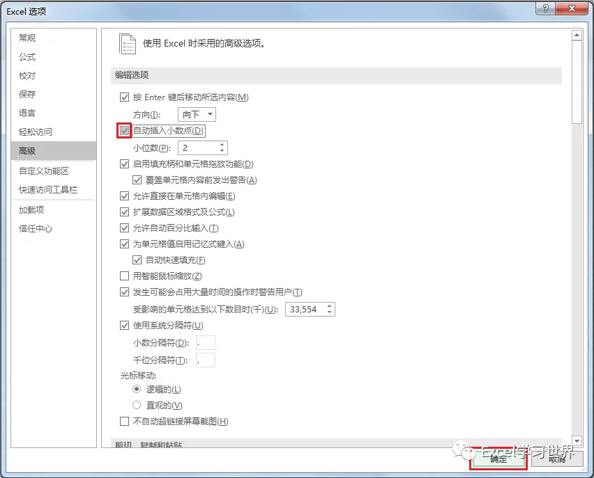 2. 在弹出的“Excel 选项”对话框中选择“高级”--> 在“编辑选项”区域勾选“自动插入小数点”,默认的小数位为 2 位,满足本例需求 --> 点击“确定”