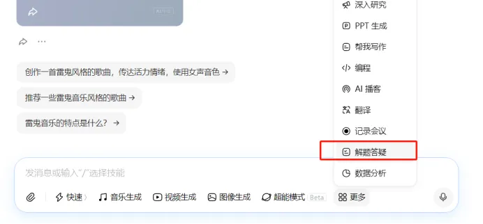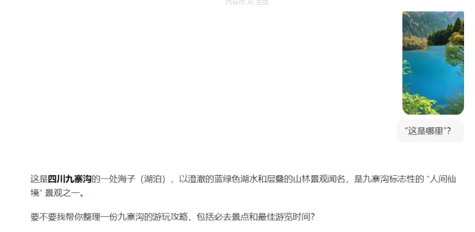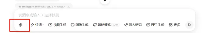 1.首页长按下方别针样按钮的输入框,点击“图片”,上传截图或拍摄的图片;2.输入问题,比如“这是哪里”“这花叫什么名字”“有没有这款衣服的同款链接”;4.识别景点时,还能追问“给我一份游玩攻略”,会生成门票、交通、美食等完整信息。实操提示:拍摄图片时尽量清晰,聚焦要识别的主体,识别准确率更高。案例4:一键生成歌曲,专属BGM自己做