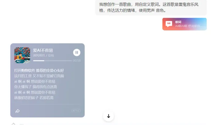 - 按格式输入需求:“生成一首【曲风】【氛围】【人声】【时长】的歌曲,主题是【自定义】”;