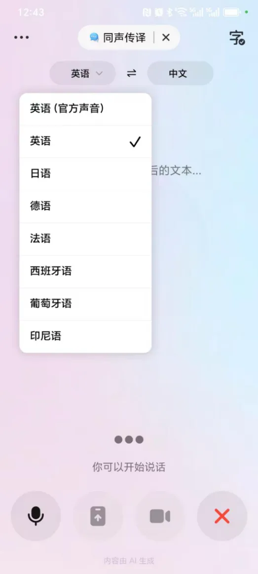 - 语音翻译:长按输入框,点击“语音”,说中文或英文,自动实时翻译;