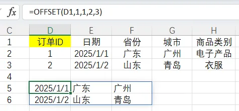 A1为起点,向下移动6行,列不动(0),取区域:(3行1列)