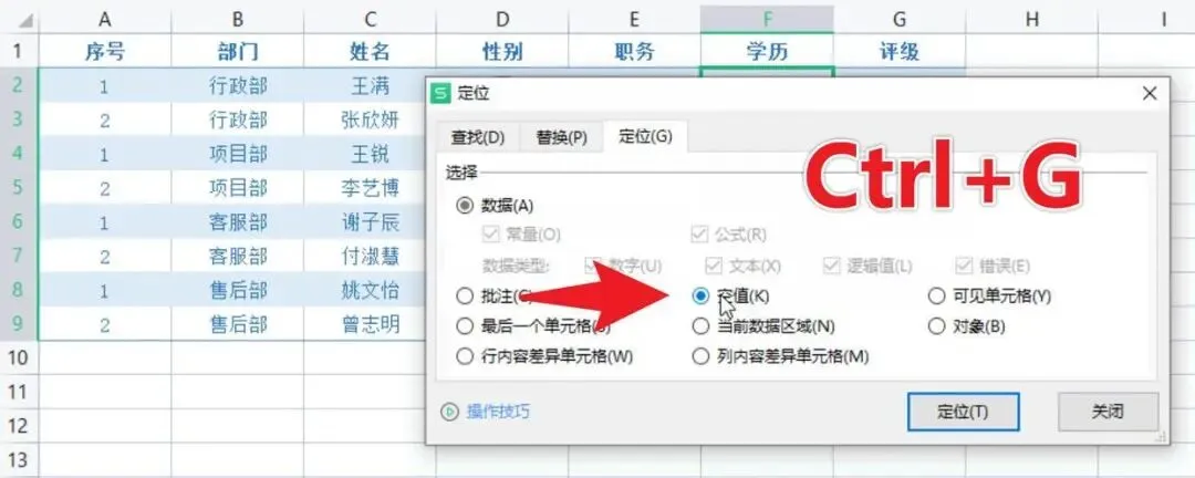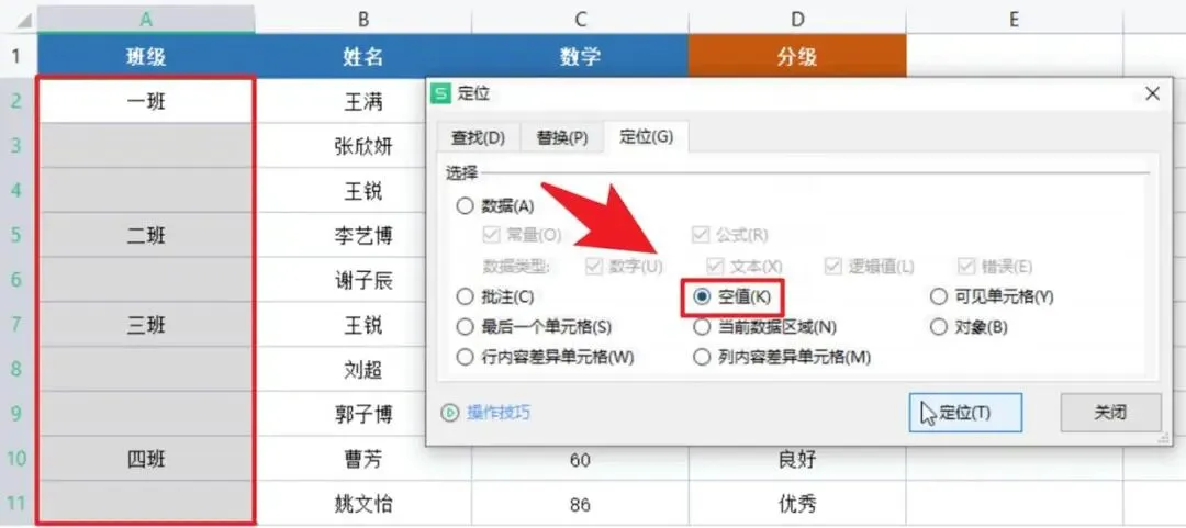 Ctrl+G组合键,在弹出的“定位条件”对话框中选择“空值”选项,点击“确定”,Excel会自动选中该列中所有的空白单元格。