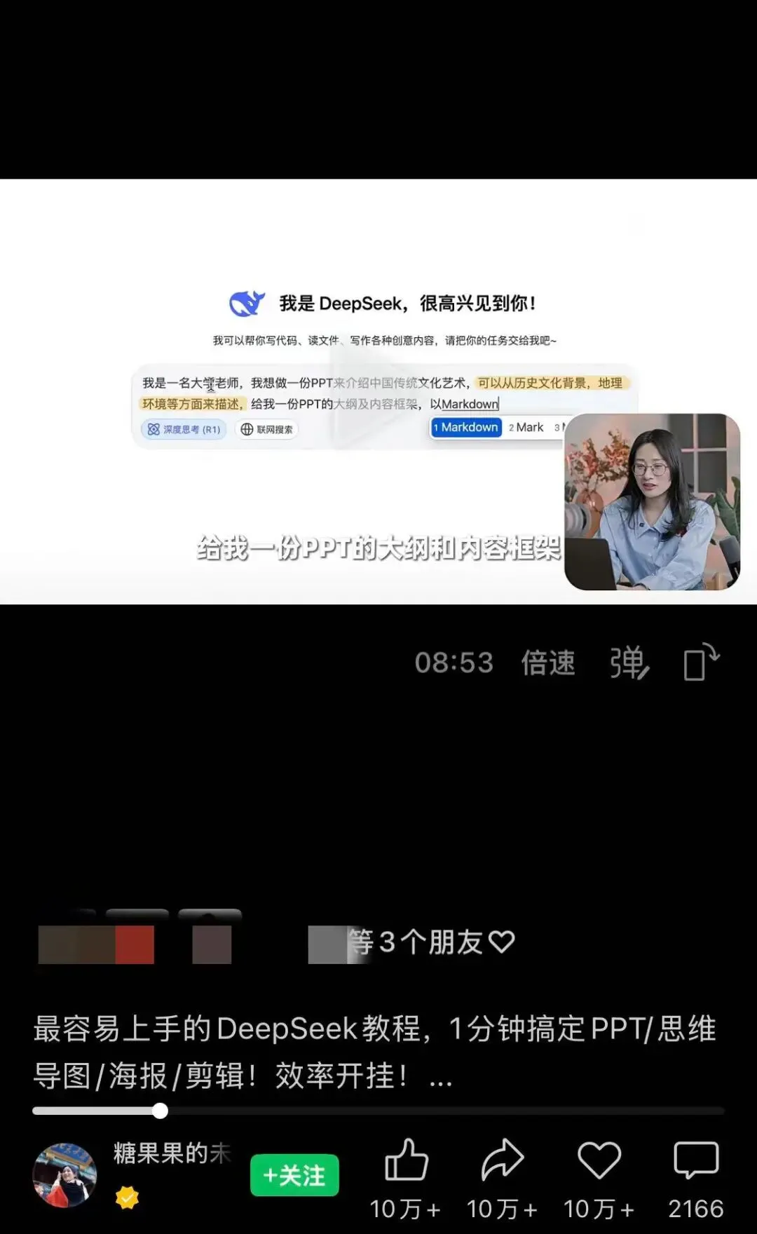 这个老师的视频介绍了很多运用deepseak和其他工具软件的方法,除了做PPT,还能做思维导图、海报等等,操作方法讲解得很详尽,可以跟着手把手操作,看起来一点不难。