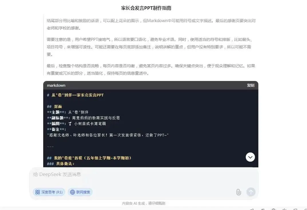 了解完方法之后的下一步就是把步骤列清楚了:用deepseak生成mark down格式的PPT提纲,复制到Kimi,就可以用kimi一键生成PPT了。