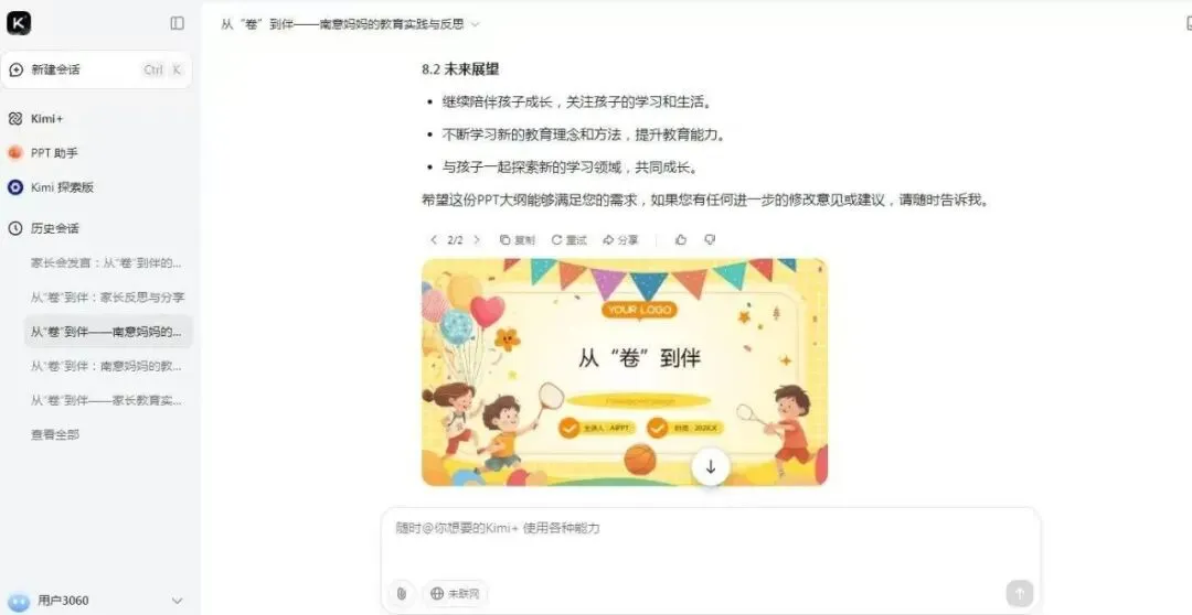 还有问题二:就是kimi生成的PPT没有额外的图片啊!就是除了原本的PPT模板中格式化的图片和插图,没办法生成跟我的PPT文字内容相符合的图片。