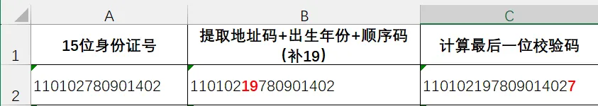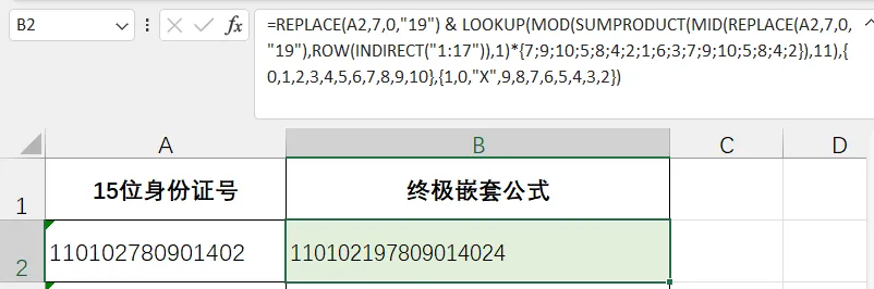 把这个公式粘贴到B1,然后下拉填充,你会发现所有15位号码都变成了标准的18位。