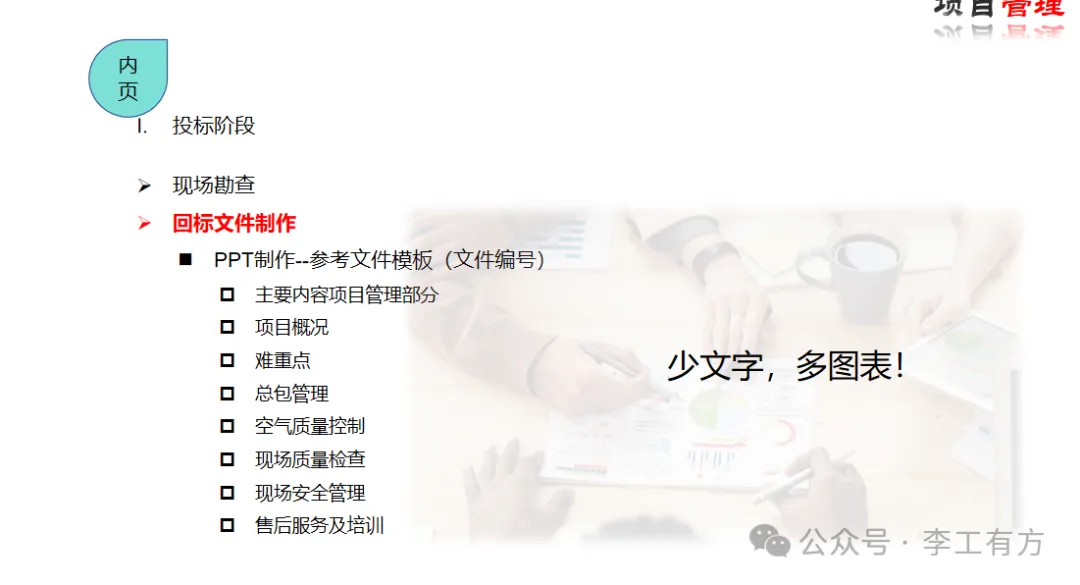以上内容,是由市场、设计师或机电设计的同事配合完成述标PPT的前半部分,接下来的重点就是项目管理的部分,这一部分内容需要由由项目经理来进行编制完成,也是述标工作的重头戏。