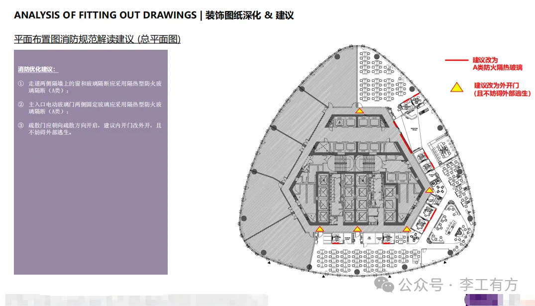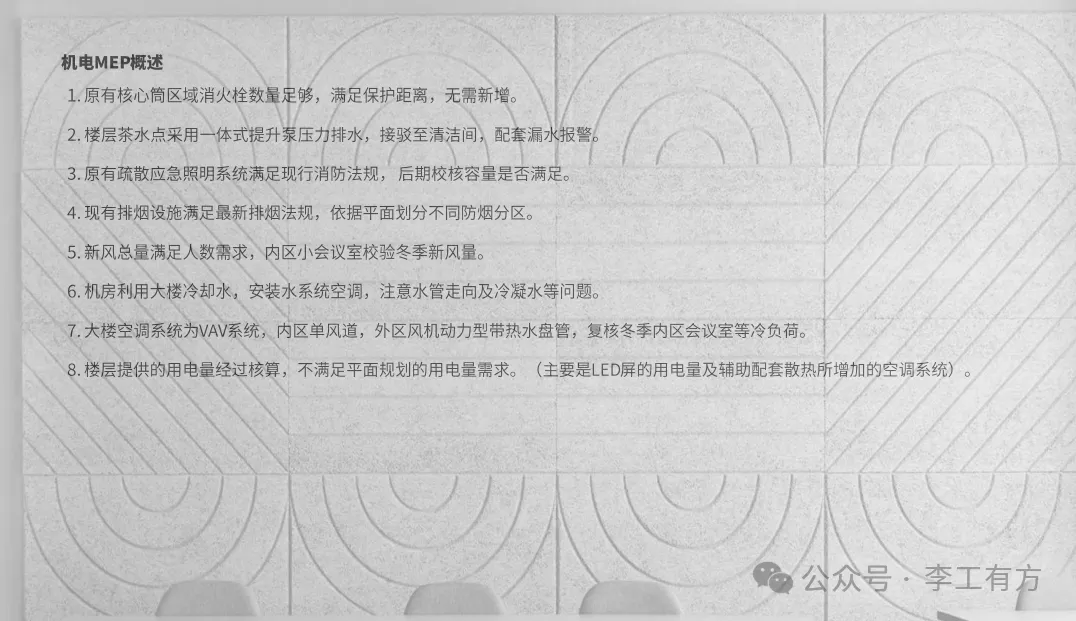 这部分内容需要重点关注。机电设计师在现场勘查的基础上,平衡物业所能提供的条件和建设方实际需求是否存在差异,并给出最优的设计方案,比如,用电量的复核确认是否需要增容,涉及费用预计的金额罗列或预估;冷量的复核,确认空调主机的型式,介绍空调系统的特点,确定是否需要加班空调及室外机的位置确认;重点需要关注机房的电量及冷量的需求;消防排烟的形式是否符合新的消防设计规范、双路供电情况、给排水情况等---由机电设计师负责。