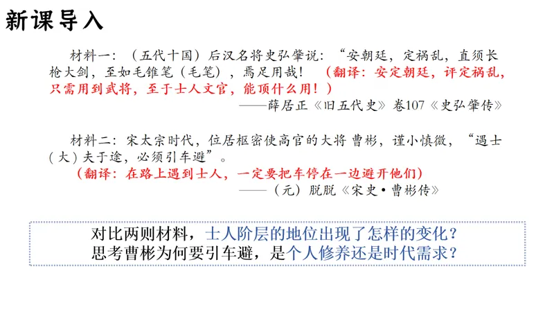 新课导入其实我是借鉴了王继平老师和魏煌在《中学历史教学》发表的一篇论文——《刻画“士人”群像,理解时代特征——以部编版七下第6课“北宋的政治”为例》中的材料。只是二位老师是拆开来使用,而我合并在一起来进行设问。