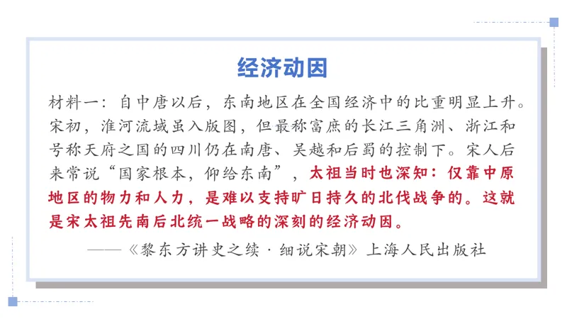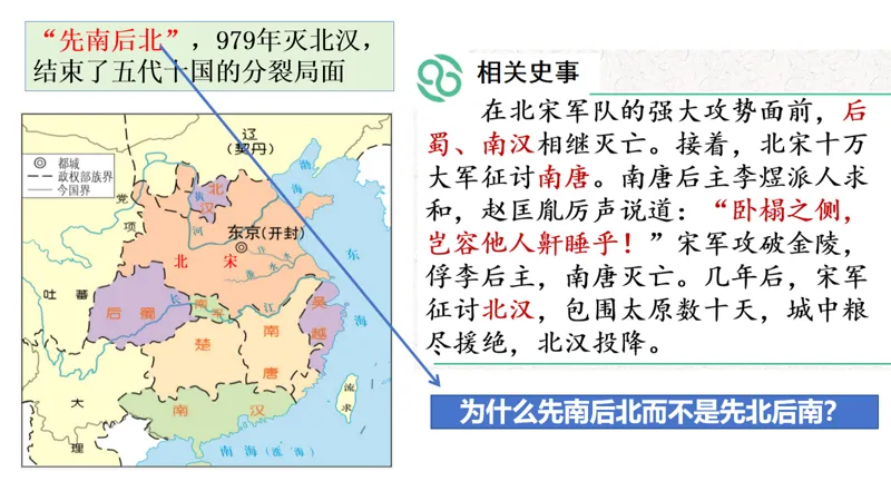 在讲到北宋的统一时,笔者自然而然地产生了疑问,即宋太祖为什么要采取先南后北而不是先北后南的策略来统一呢?为此,笔者找到了相关的材料,能从经济动因来理解这一决策的智慧与远虑。