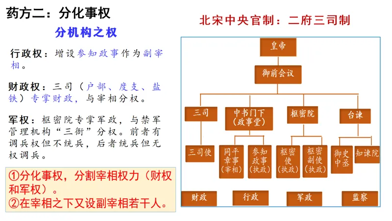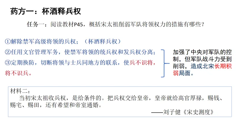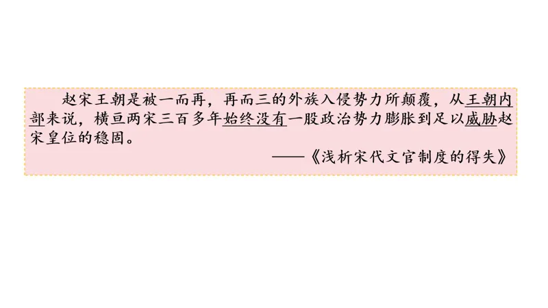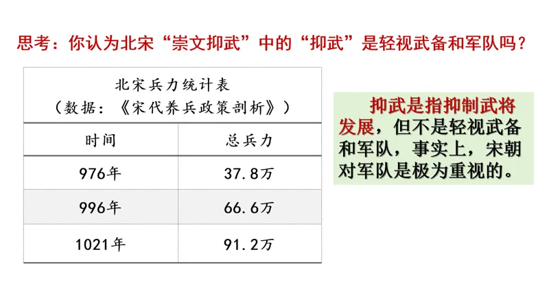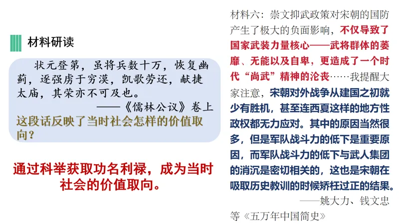 其中在对于崇文抑武的讨论之中,笔者根据教学设计中设计的教学难点——崇文抑武的双重影响,选取了相关的材料进行说明。但大段的材料并非是让学生快速阅读理解,而是方便我的讲述,这也是我习惯的PPT模式。