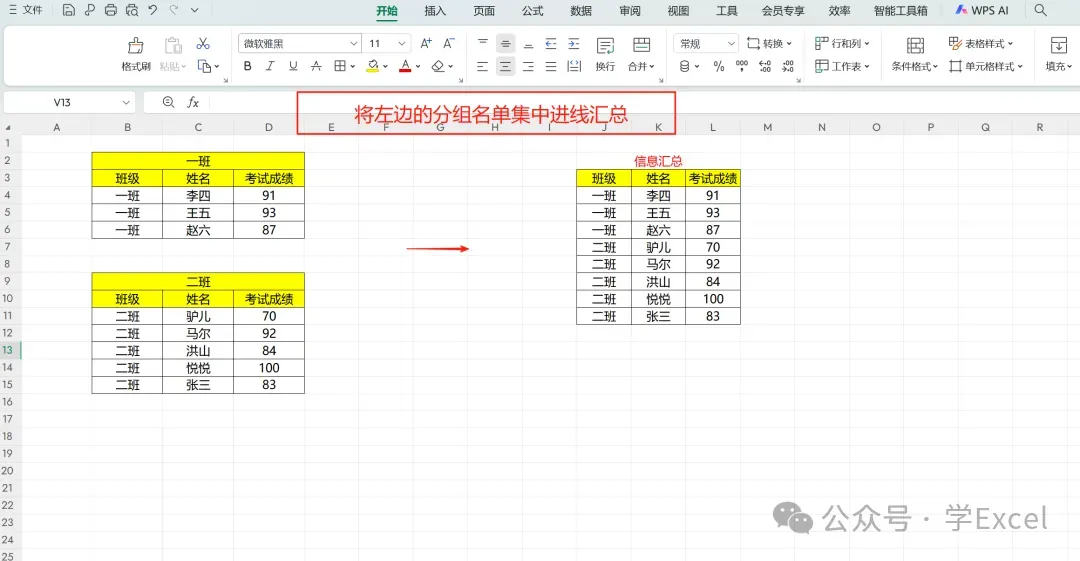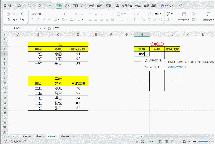 - 如上图所示,我们需要将不同班级的测试成绩合并汇总到一张表。下面来看看Vstack函数如何使用。