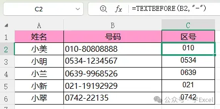 - 如下图所示,要根据A列的号码,提取减号前的区号,也就是需单独提取区号。TEXTBEFORE函数用于返回指定间隔符号前的字符。TEXTAFTER函数用于返回指定间隔符号后的字符。