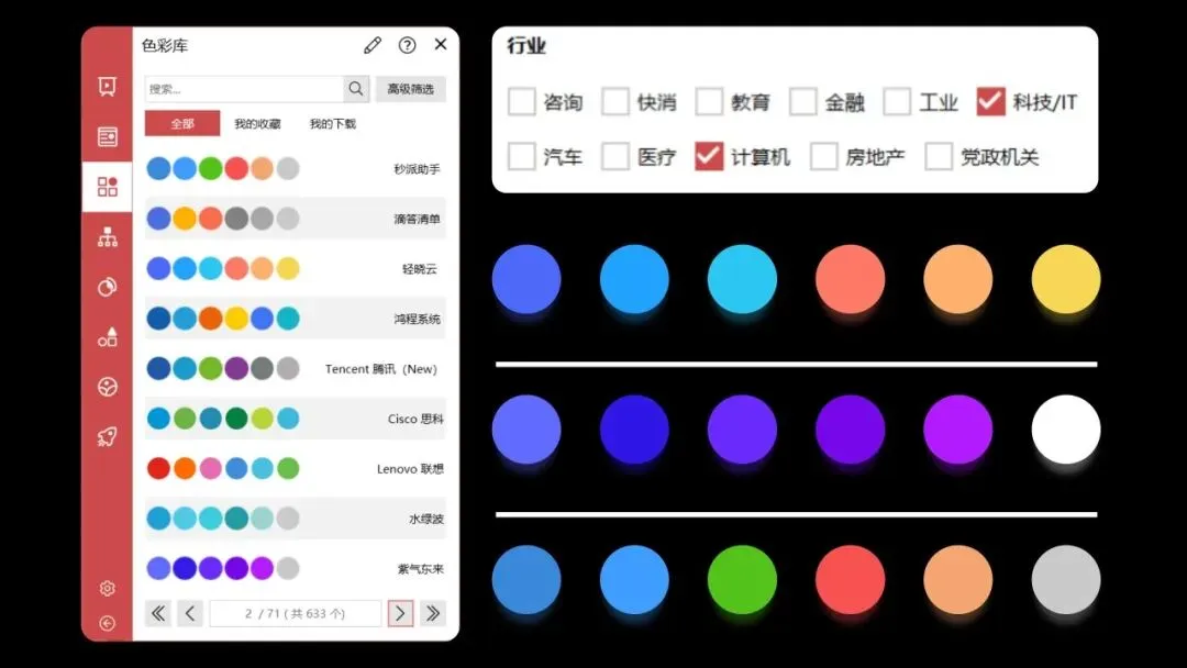 可以利用 iSlide 配色库,当筛选「科技/IT」、「计算机」后,足足有633组配色可以直接复制使用,每一组又有6种颜色,还是主题色模式: