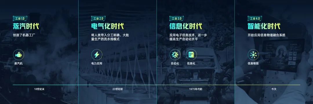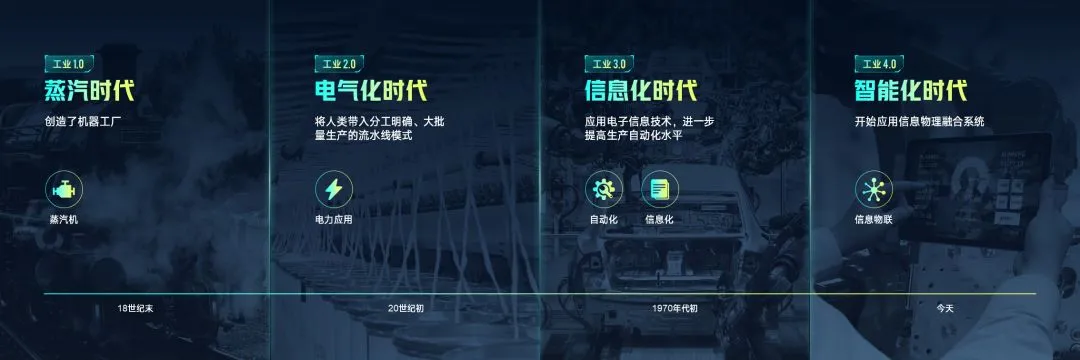 从内容分析可知,这是一页时间轴的页面,主要表达的,是工业革命的4个阶段: