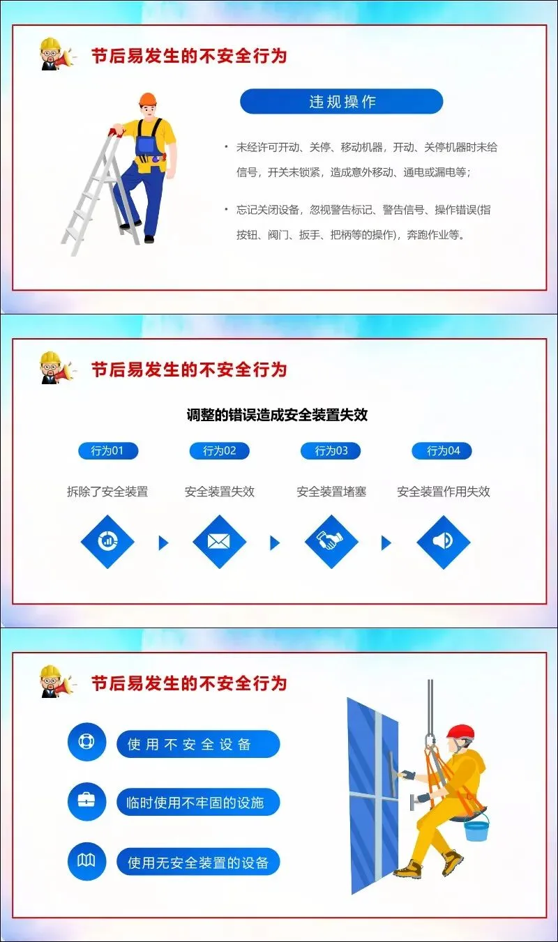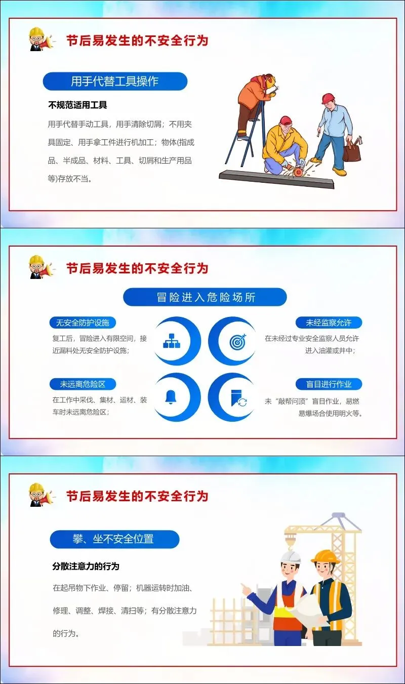 “节后综合症”: 员工刚从节日氛围中返回,生活节律未调整,存在疲惫、情绪不稳定、思想不集中等现象(如惰性、侥幸、冒险、逞能、麻痹心理),这是导致人为事故的重要隐患。