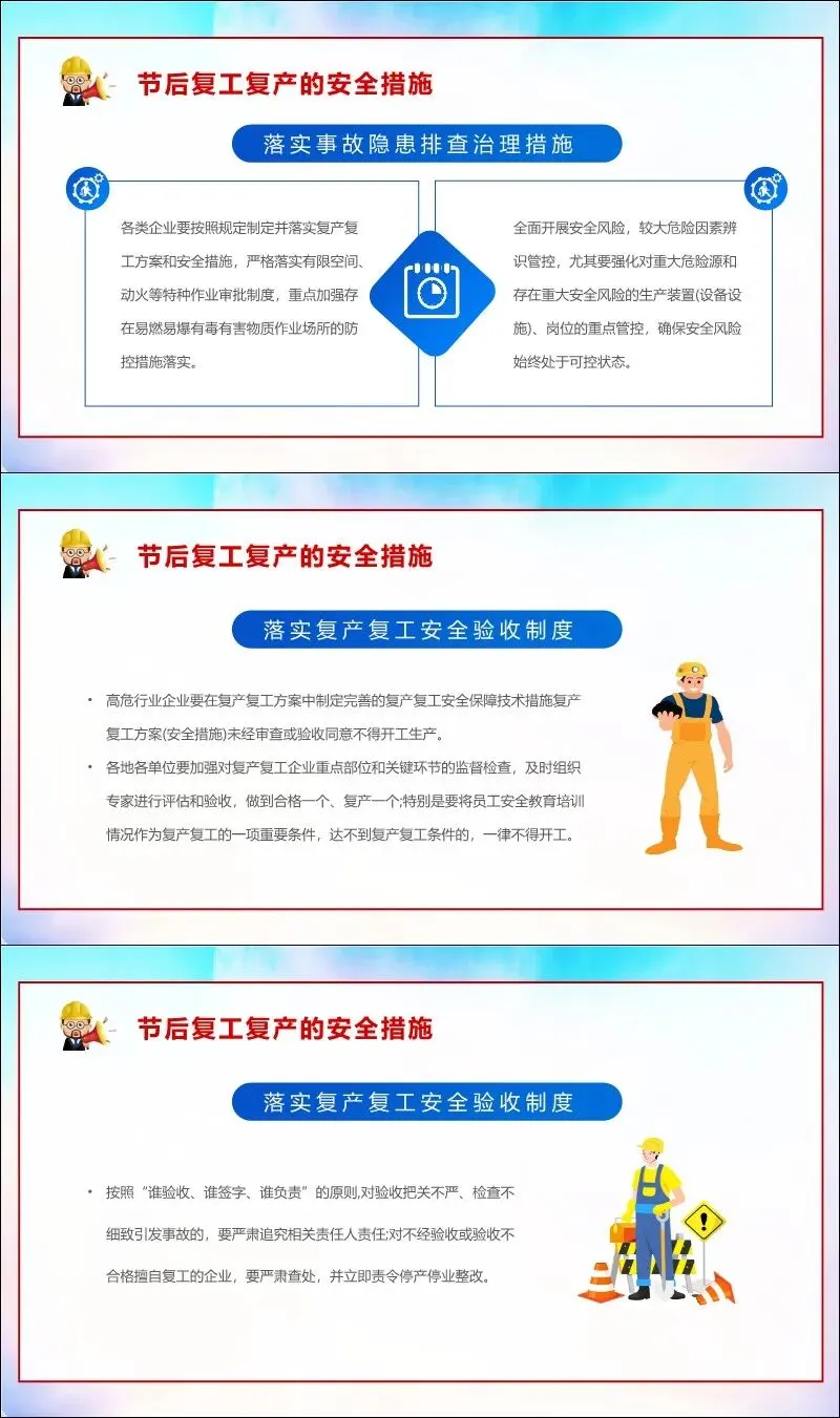落实主体责任: 企业主要负责人和安全管理人员需及时到位,召开安全会议,制定切实可行的复工方案,特别是高危行业(危化品、锂电池、粉尘等)需完善应急预案并演练。