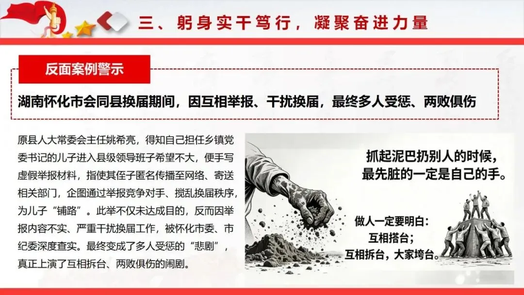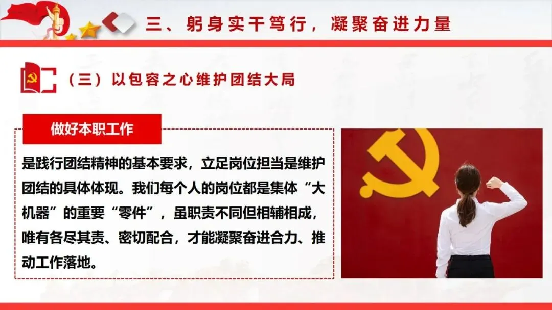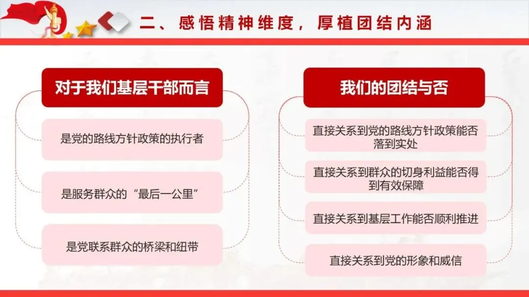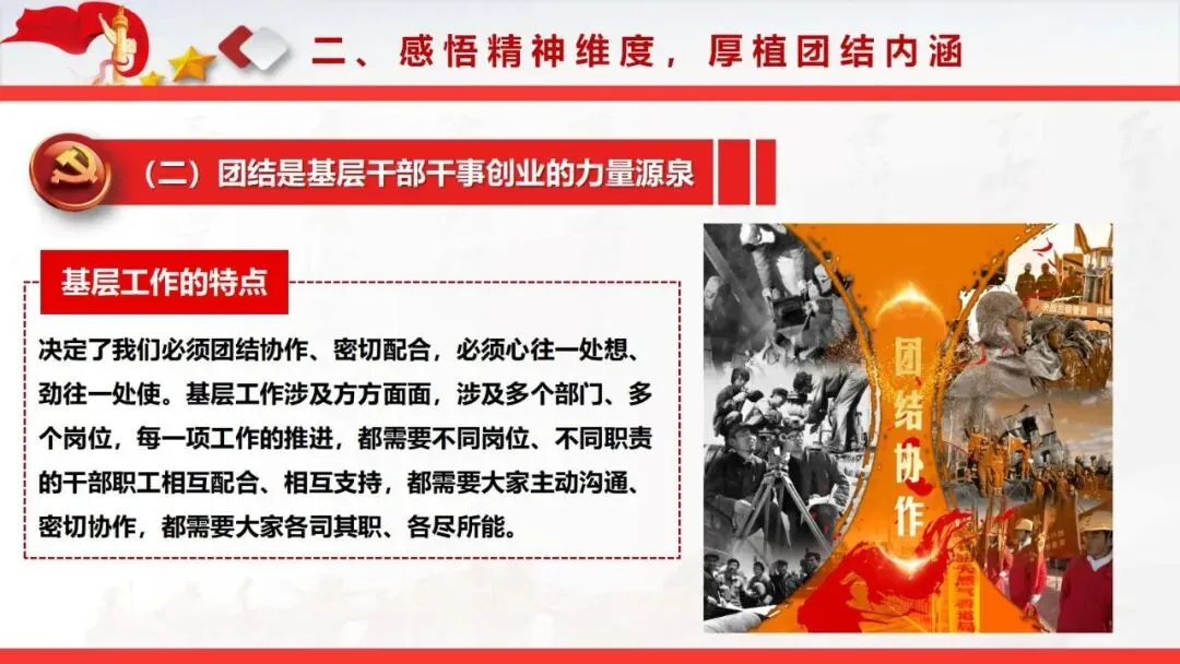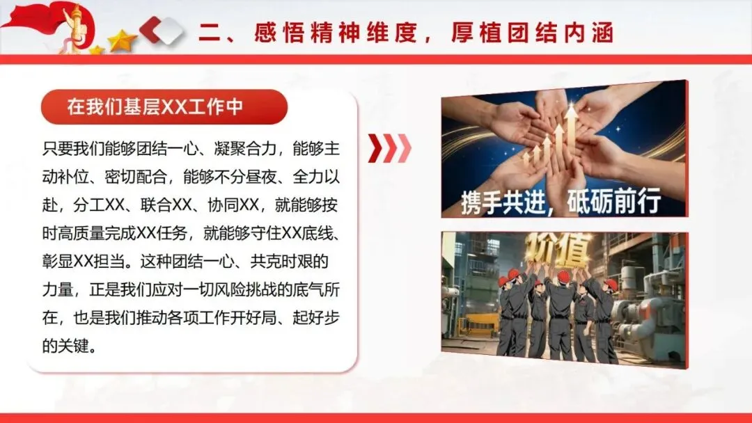 本次党课以 “团结” 为核心,通过回望历史印记阐释团结担当的精神内核,从党史、古今案例、当代实践多角度剖析团结的时代内涵,更结合基层工作实际,指明以忠诚、实干、包容、廉洁之心凝聚奋进力量的实践路径。内容兼具思想深度与实践指导,内容丰富、案例鲜活、杜绝枯燥,为新一年工作开好局、起好步凝聚强大合力!