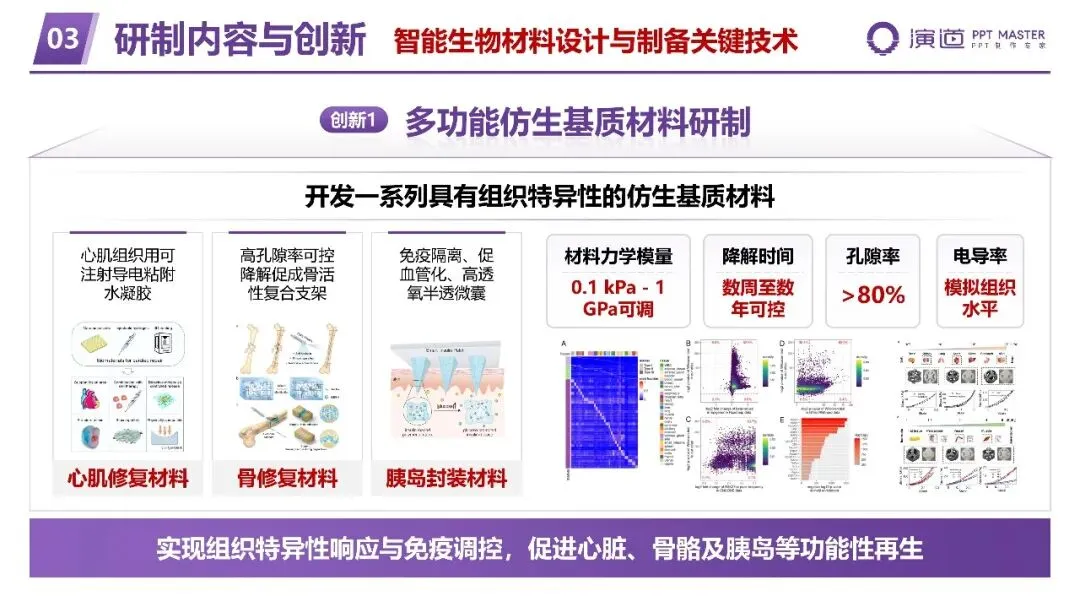 智能生物材料设计与制备关键技术:开发一系列具有组织特异性的仿生基质材料,包括心肌修复用可注射导电粘附水凝胶、高孔隙率可控降解骨修复支架、免疫隔离胰岛封装材料等,实现材料力学模量(0.1 kPa~1 GPa)、降解时间(数周~数年)、孔隙率(>80%)等关键参数的精准调控,促进心脏、骨骼及胰岛等组织的特异性再生与免疫调控。