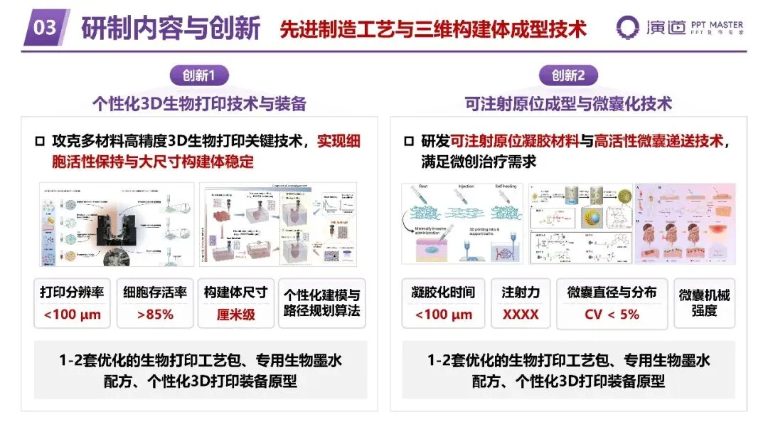 个性化 3D 生物打印技术与装备:攻克多材料高精度打印关键技术,实现打印分辨率 <100 μm、细胞存活率> 85%、厘米级大尺寸构建体稳定成型,形成优化的生物打印工艺包与装备原型。可注射原位成型与微囊化技术:研发可注射原位凝胶材料与高活性微囊递送技术,满足微创治疗需求,实现凝胶化时间 < 100 μm、微囊直径 CV<5% 的精准控制。三、价值与意义