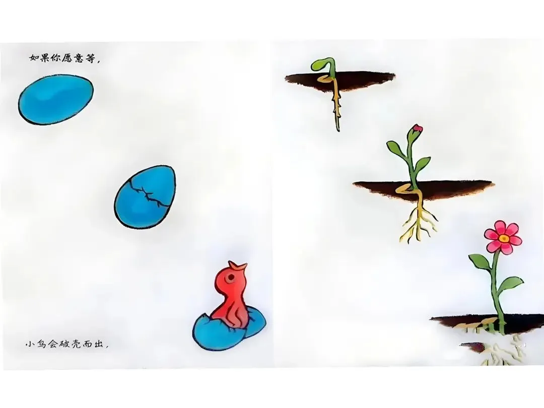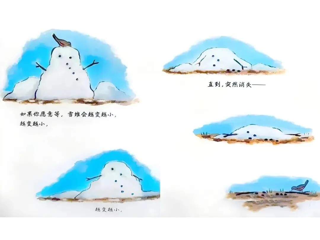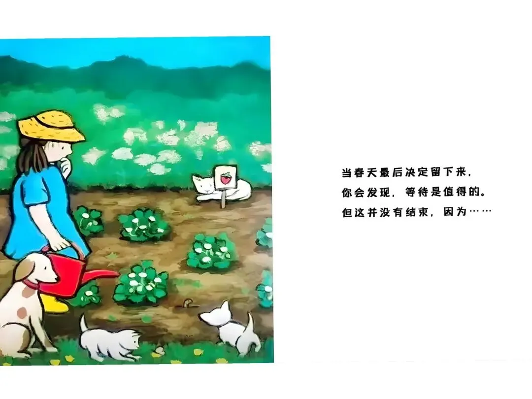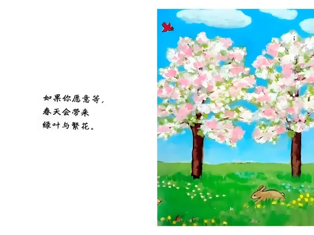 如果你愿意等,雪堆会越来越小,越变越小,越变越小。直到,突然消失---春天来之前,草是棕色的。如果你愿意等,春天会把它变绿,再点缀一些小花。春天来之前,花园里满是尘土,空荡荡的。如果你愿意等,春天会让绿芽破土而出,铺满整个花园。春天有时候来得快,有时来得慢。它总是变换心意。当春天最后决定留下来,你会看到----当春天最后决定留下来,你会发现,等待是值得的。但这并没有结束,因为…还有夏天。