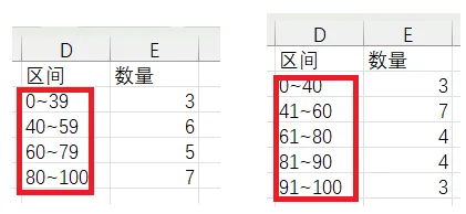 另外,关于D列“区间”,可以根据需要自由设置区间范围,只要遵循“数字下限 + 分隔符 + 数字上限”的格式(例如“0~39”),代码就能自动识别这些区间,并完成相应的计算。如下图所示,