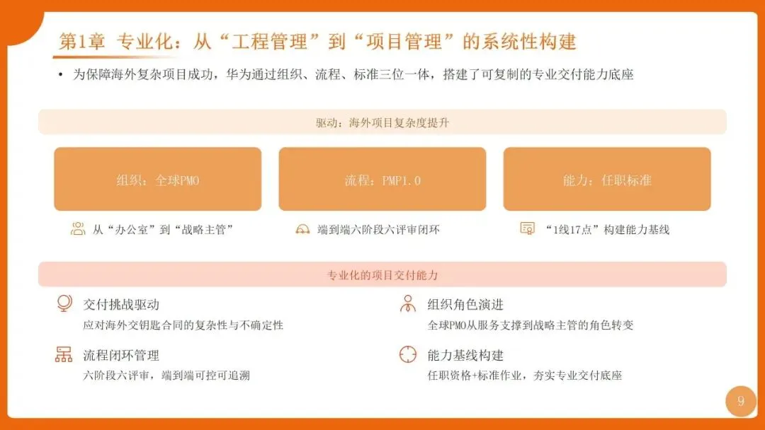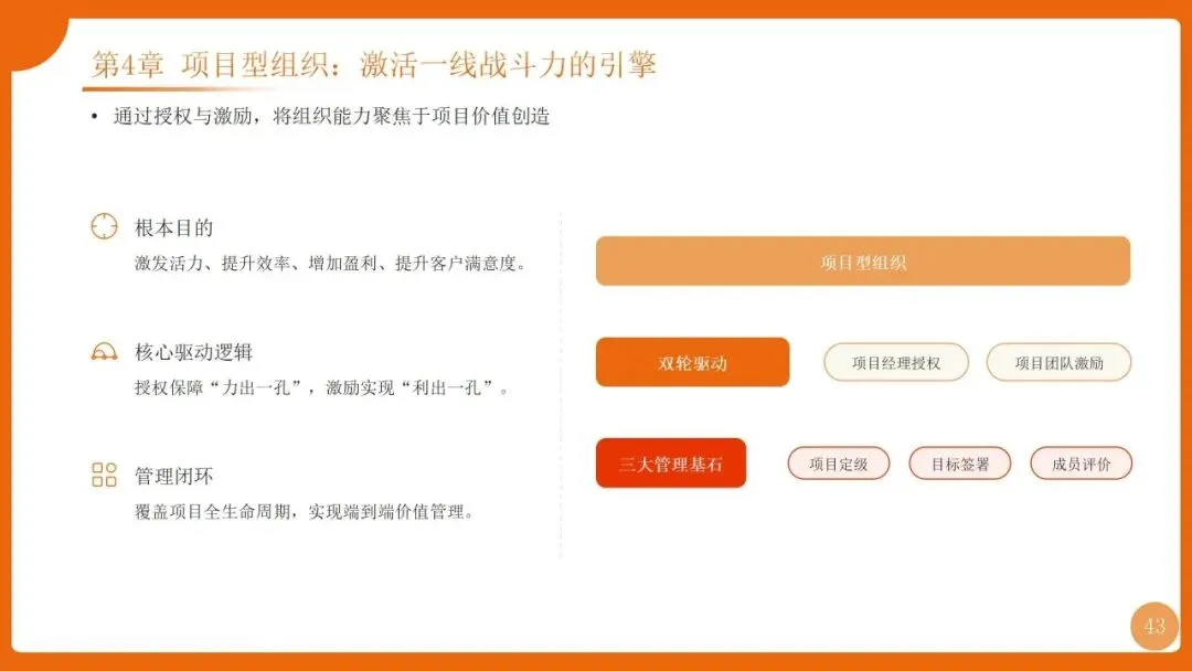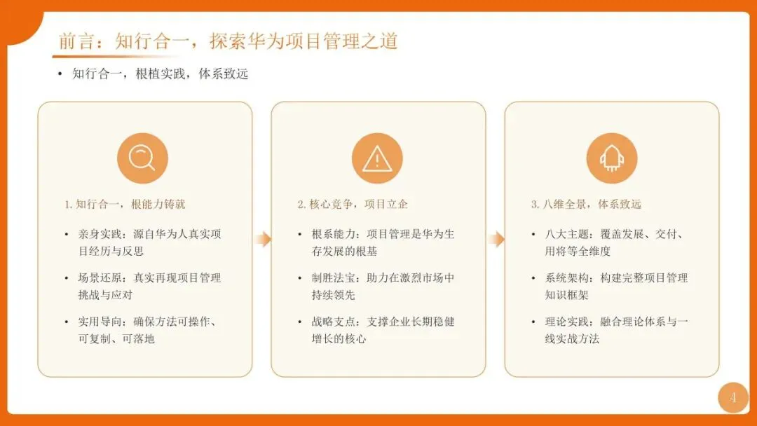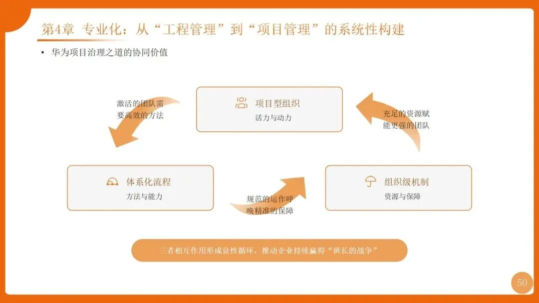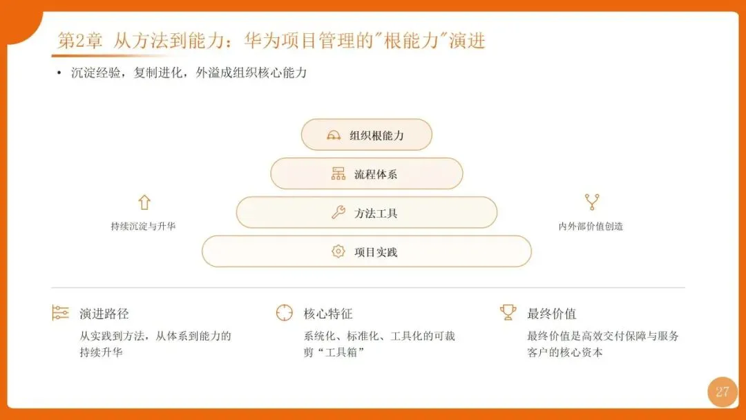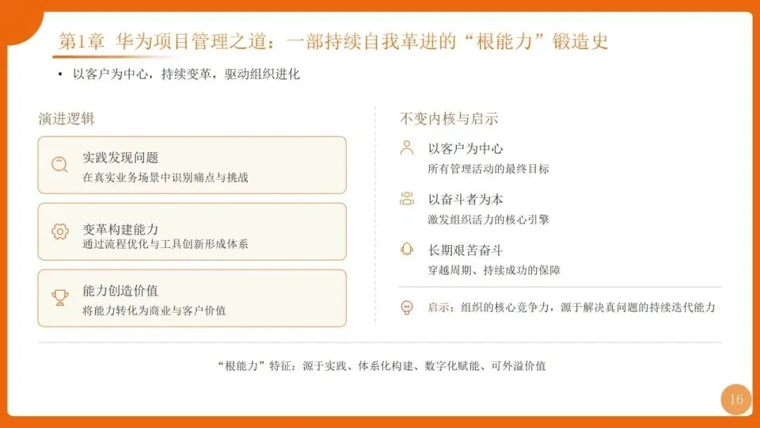 | 项目管理是华为“根能力”,以“以项目为中心”为核心,实现从“任务执行”到“价值创造”的转变,聚焦价值循环与商业成功 | 筑牢发展根基,保障“使命必达”,支撑企业长期稳健增长 |