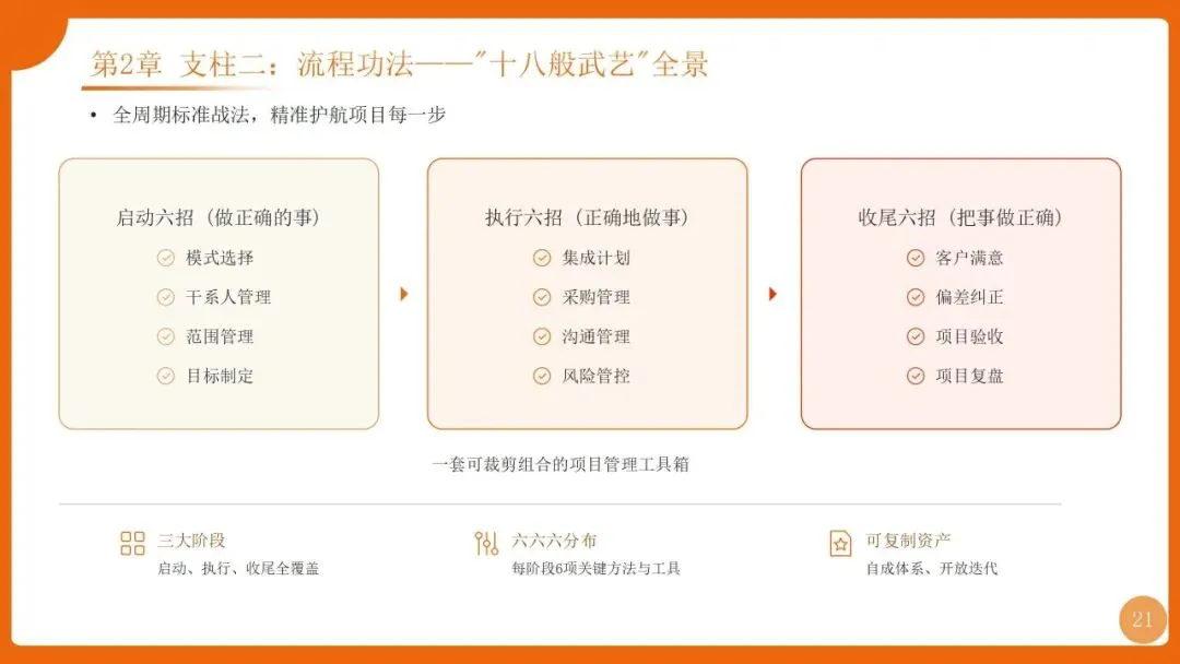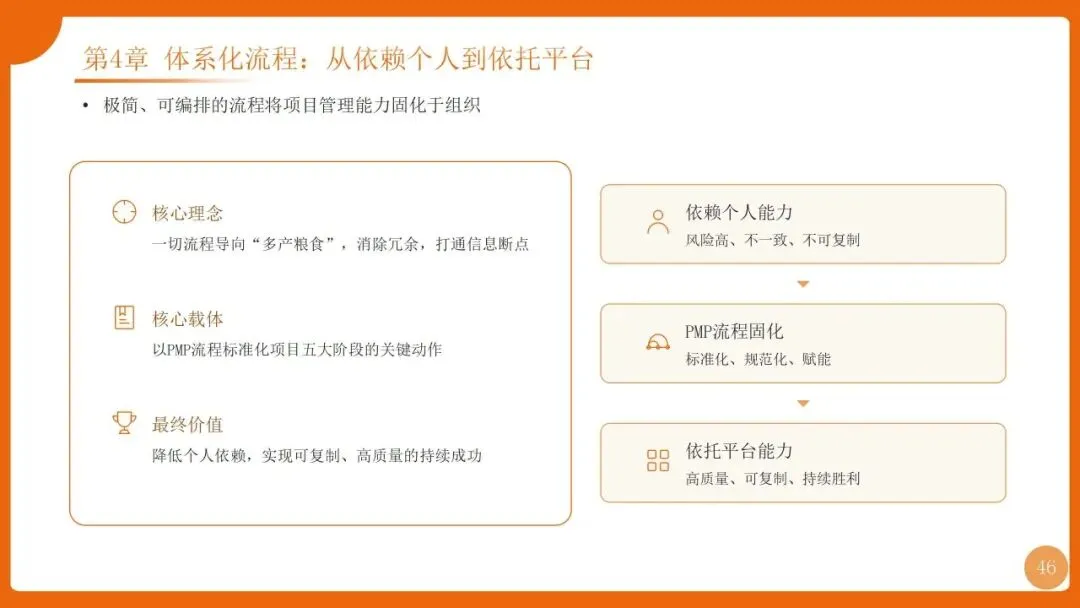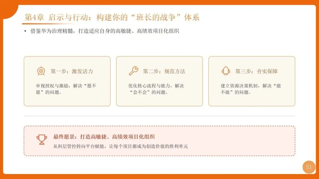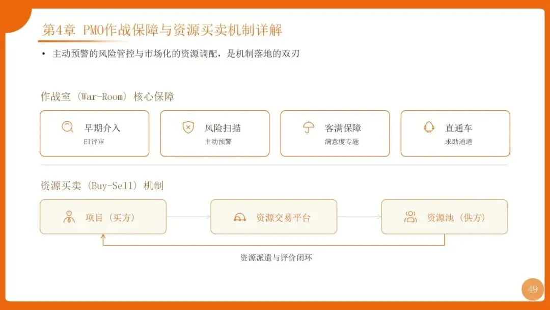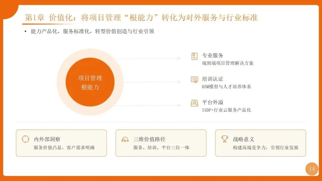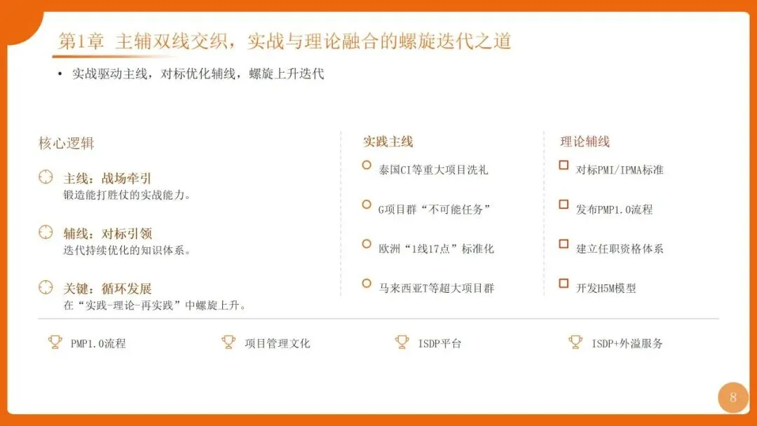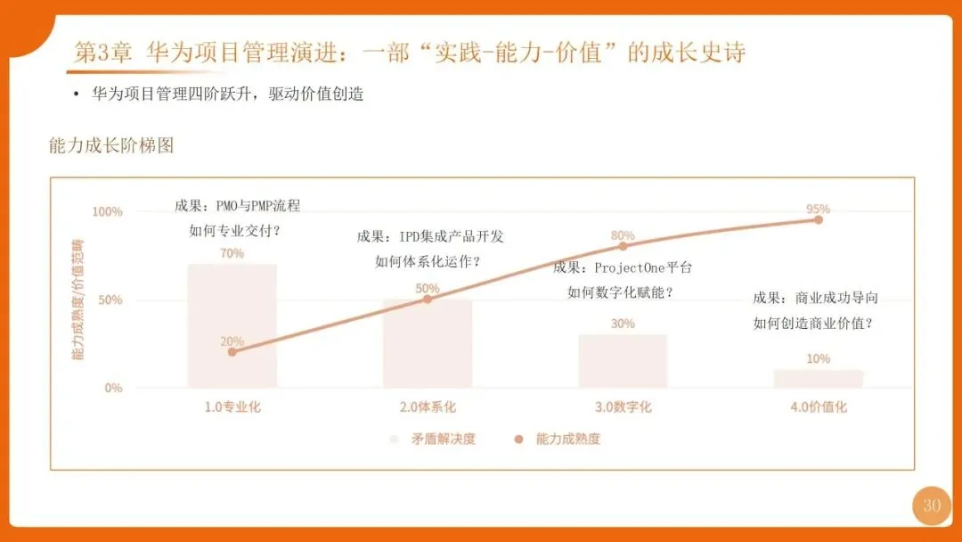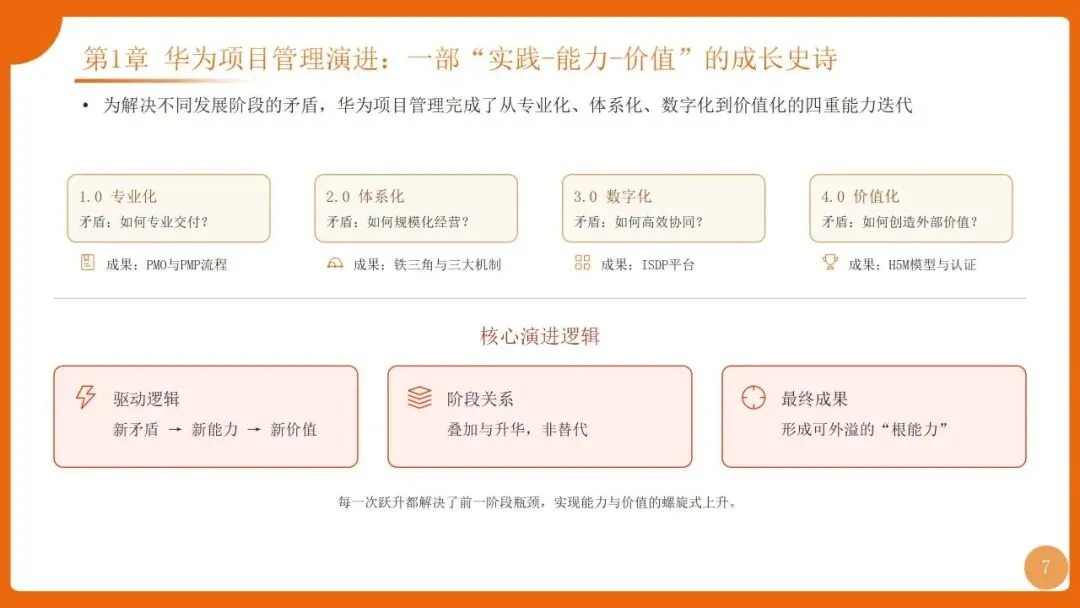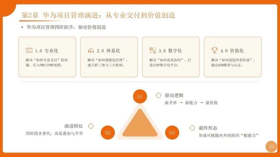 | 四阶迭代:1.0专业化(PMO+PMP流程)、2.0体系化(铁三角+三大机制)、3.0数字化(ISDP平台)、4.0价值化(H5M模型+认证) | |