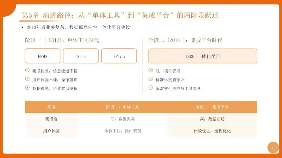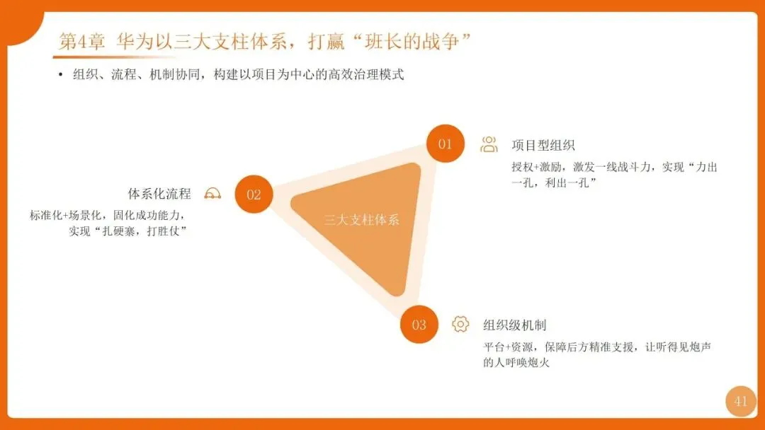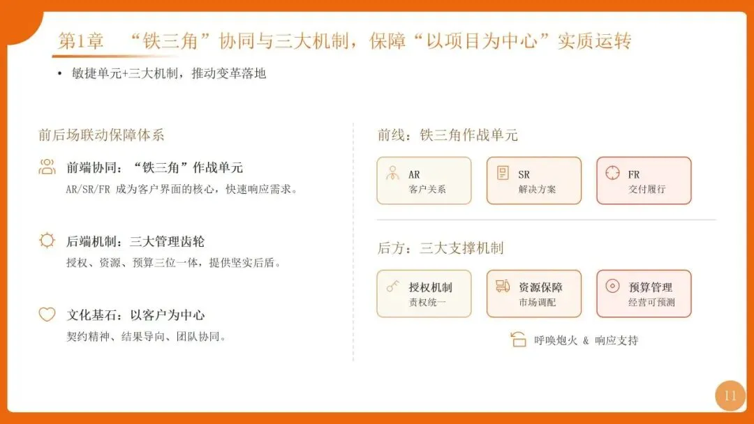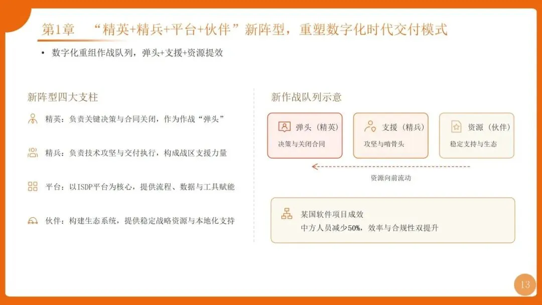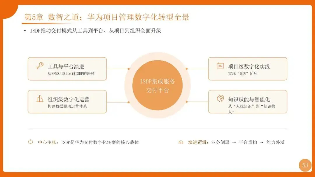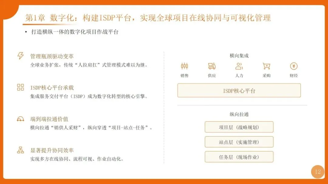 | 组织:强矩阵结构+项目型组织;流程:PMP端到端流程+“十八般武艺”;工具:ISDP集成服务交付平台 | |