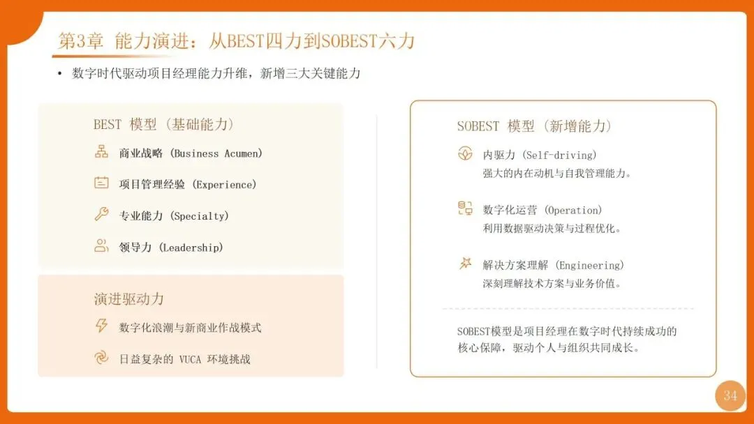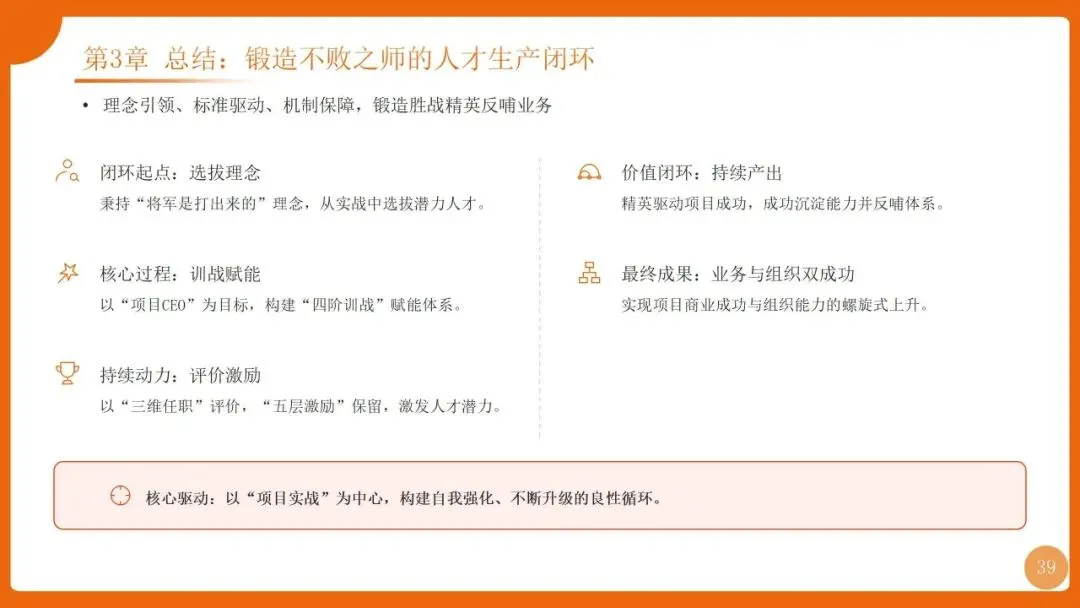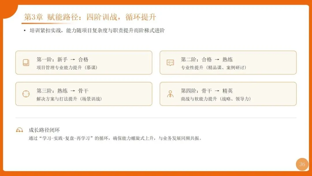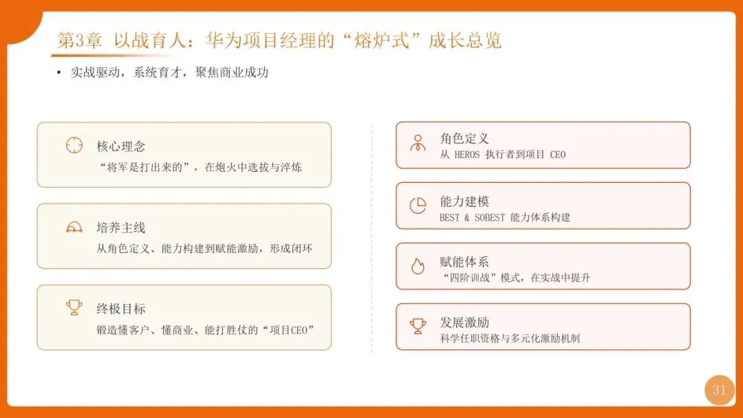 | 角色升维:从项目经理到“项目CEO”;能力模型:SOBEST六力;培养模式:四阶训战+三维任职资格 | 打造懂商业、善管理、能打仗的精英团队,反哺业务发展 |
