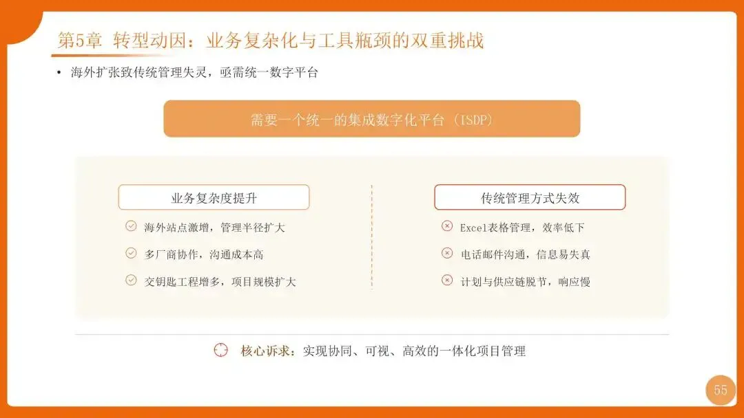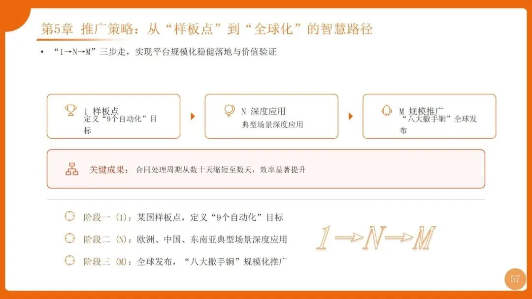 | 核心载体ISDP,“1→N→M”推广策略,构建“对象-规则-过程”三维体系,实现“知识找人” | 打破项目/国家/分散模式边界,合同处理周期从数十天缩至数天 |